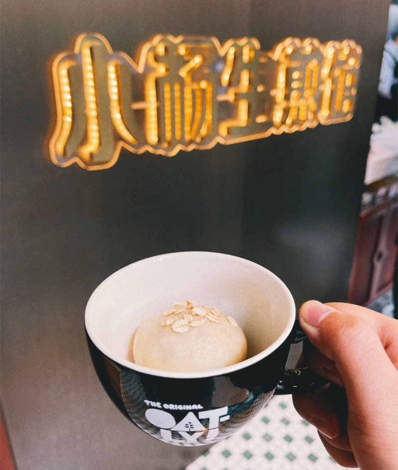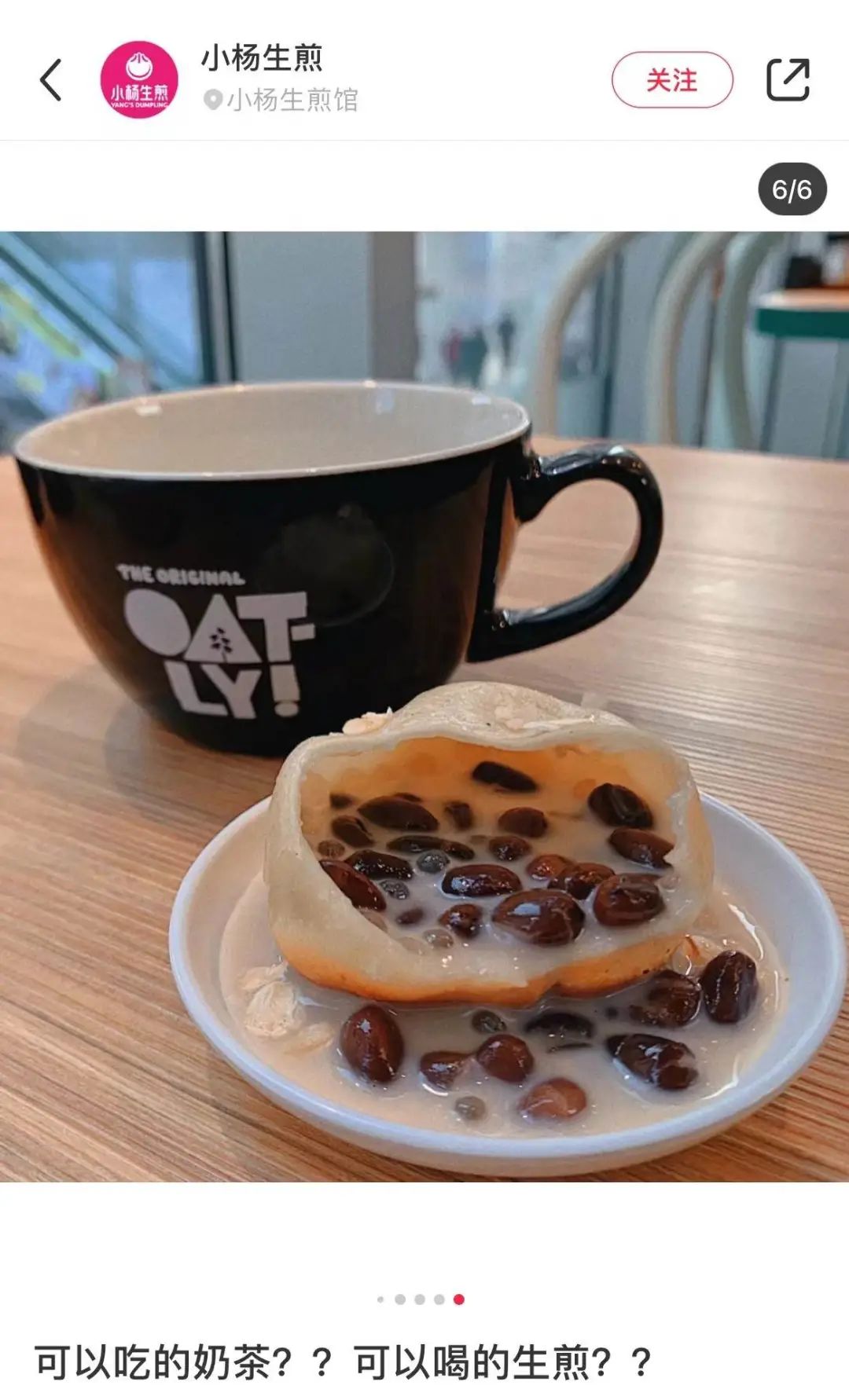 这款“伪奶茶馅”生煎由小杨生煎与燕麦奶品牌Oatly联名推出。官方介绍说,它可以让你“喝着吃,吃着喝,边喝边吃,边吃边喝!”。