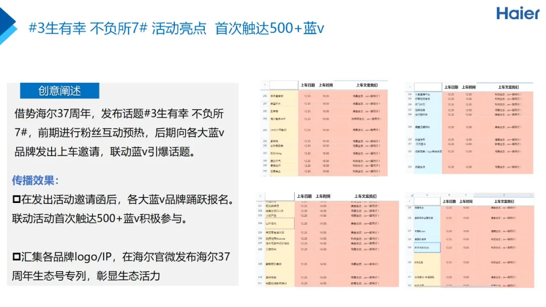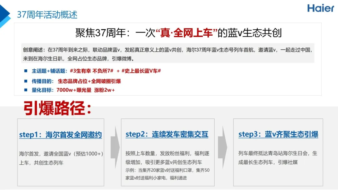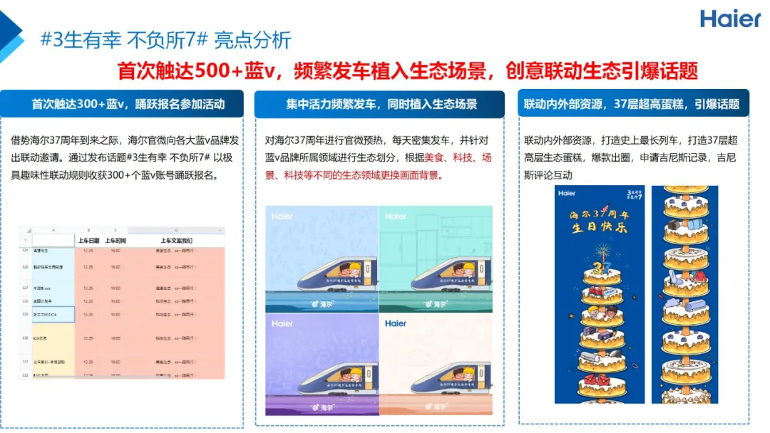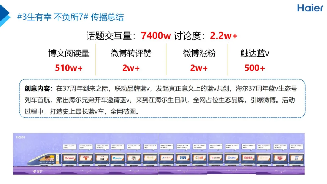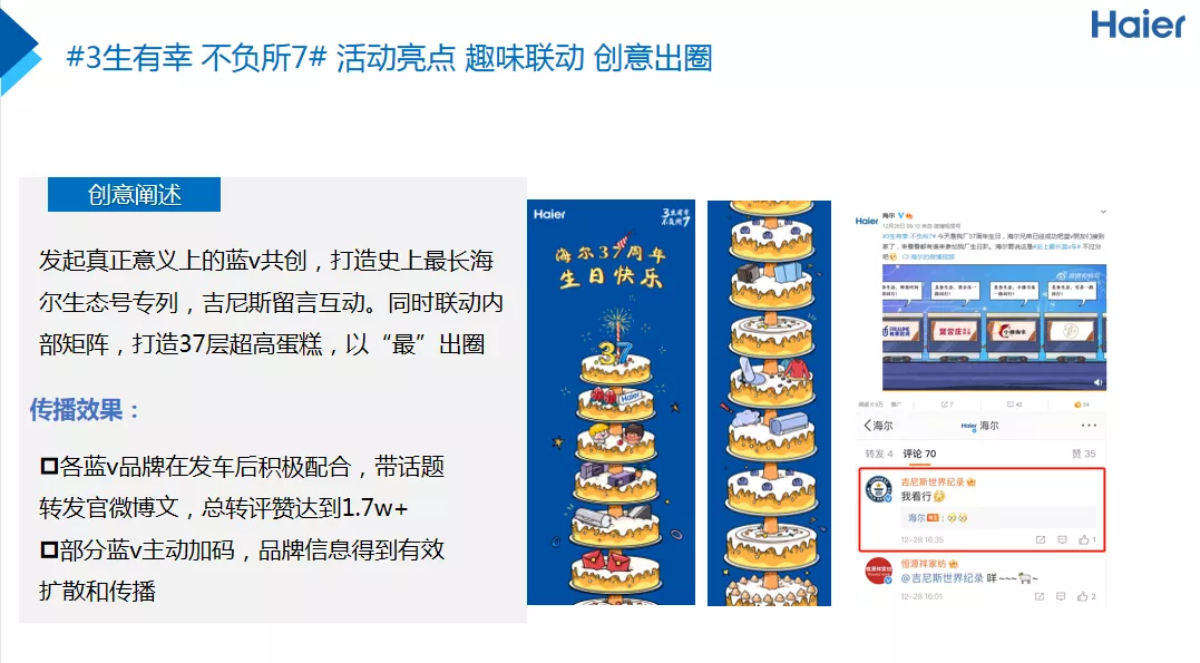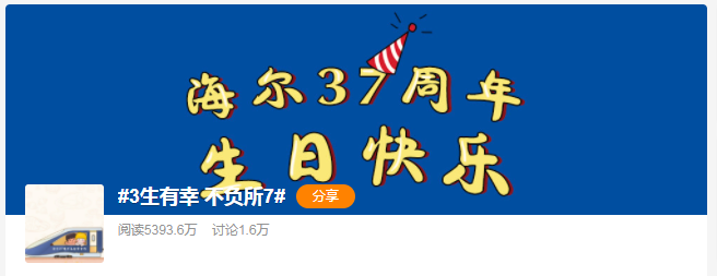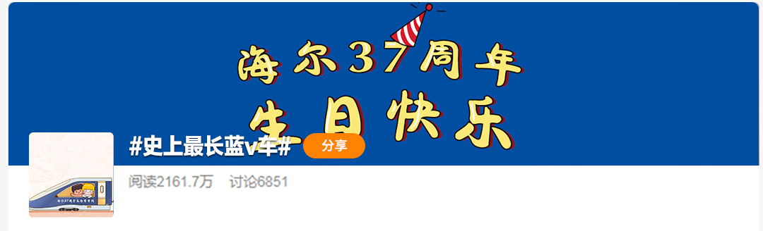 而一直有“80万蓝V总教头”之称的@海尔 官微,在其37周年庆期间推出的#3生有幸 不负所7##史上最长蓝V车#2个话题。