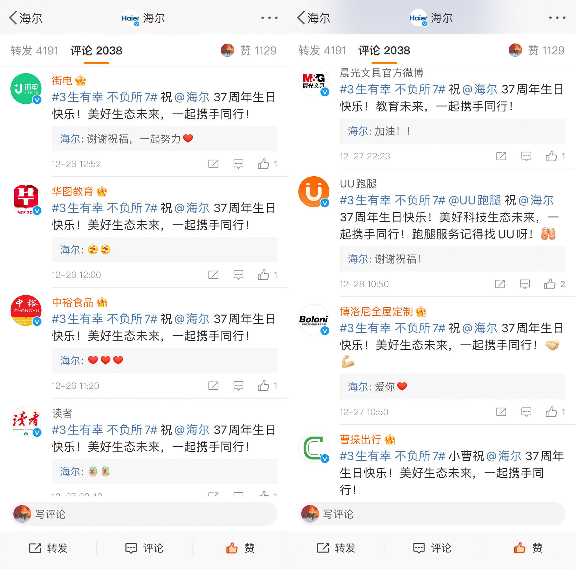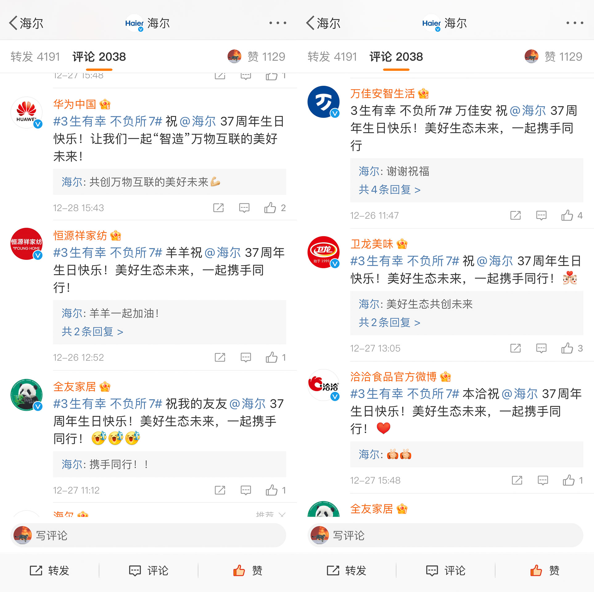 总教头一呼百应,华为、卫龙、洽洽等500+家品牌方应声而动,不仅在预热期转发@海尔 的博文,而且生日当天还在评论区带话题盖起了2000多层的楼。