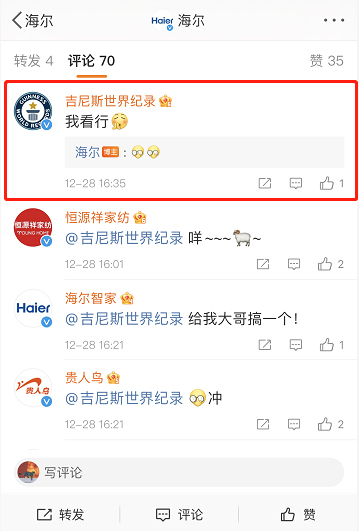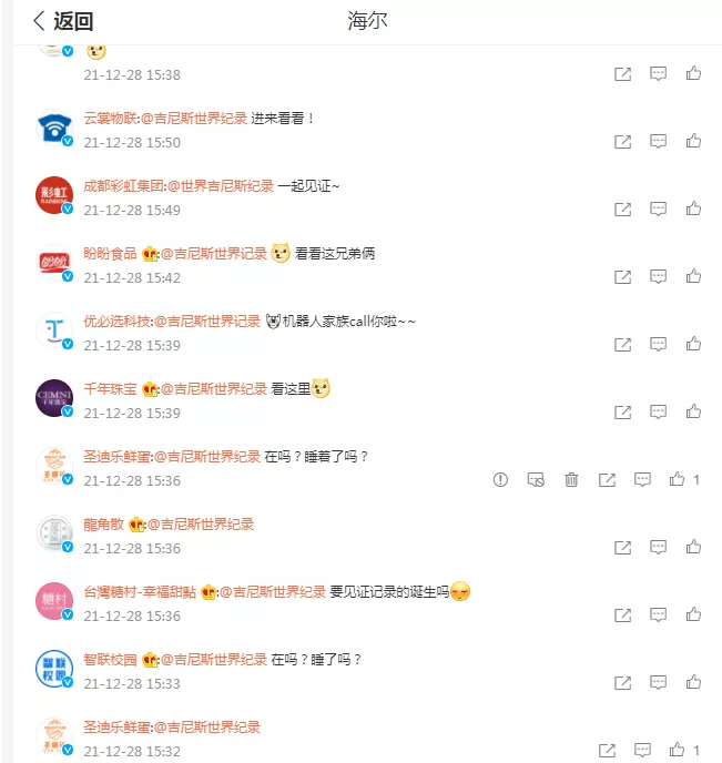 果不其然,@吉尼斯世界纪录 也做了回应“我看行!”,据了解,@海尔 正在申请这项纪录中。
