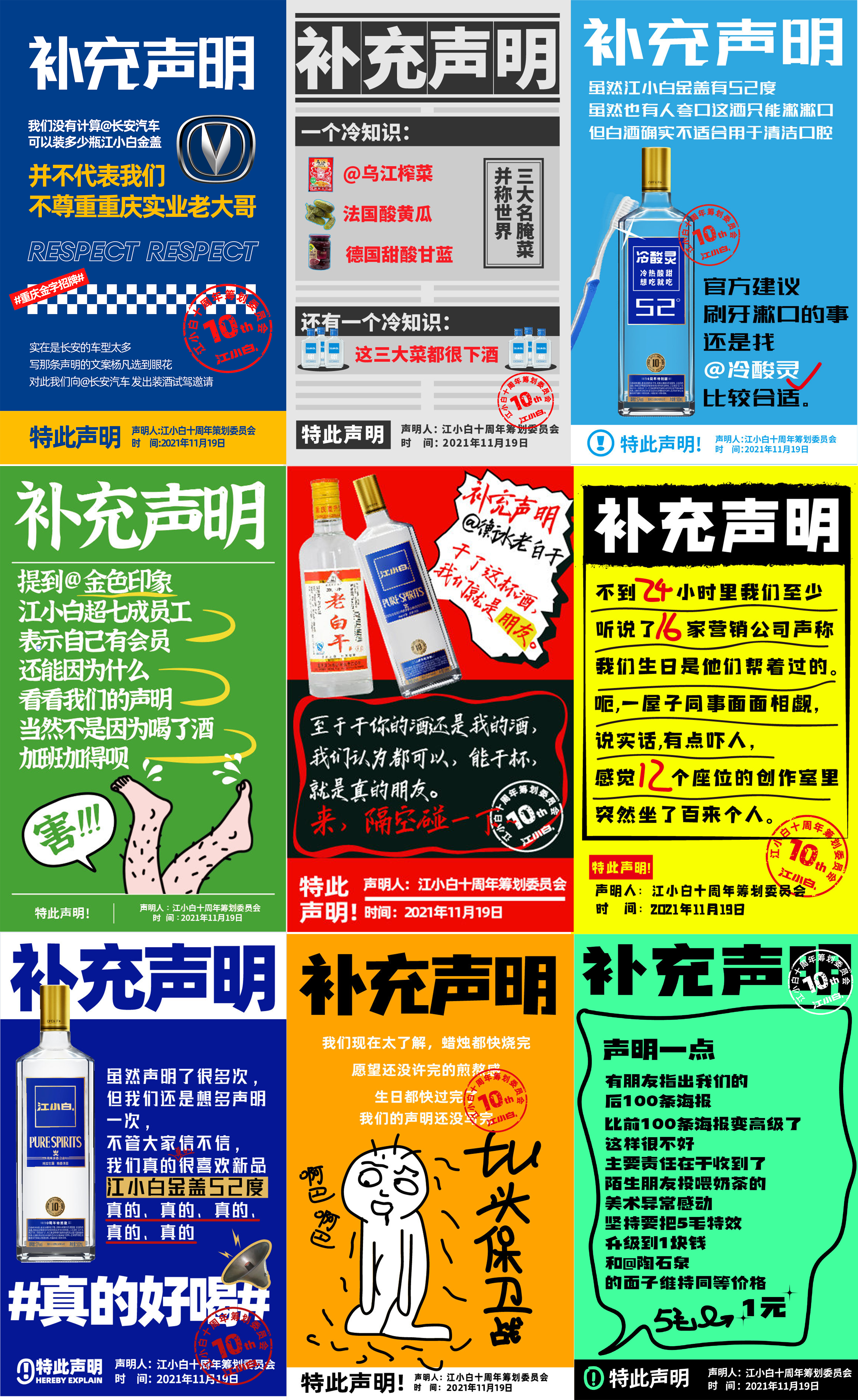 △ 江小白品牌十周年连发100张“特此声明”海报出圈