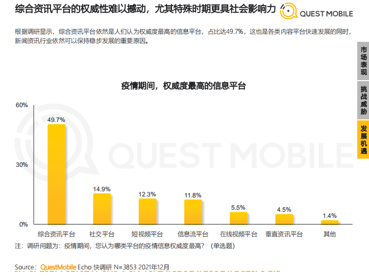 QM报告还指出,过去两年的疫情爆发期间,人们对于权威信息的关注带动了资讯服务行业流量的快速发展,报告显示2020年2月新冠疫情爆发节点,资讯服务行业月活跃用户规模同比增长率达16.4%。此外特殊时期下,综合资讯类平台的信息权威性在用户心中难以撼动,更显社会影响力。