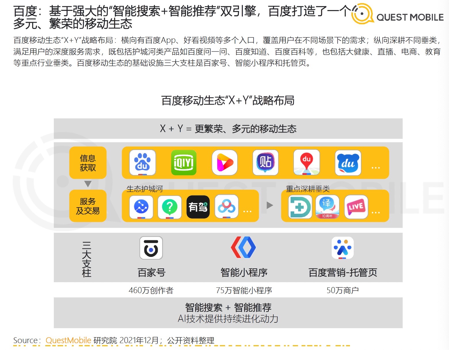 以百度App为例,目前百度App已经发展为内容+服务的综合性服务平台,其内容也不仅包括新闻资讯,更包括泛知识内容,服务更是囊括了生活服务、资讯服务等多种服务类型。也正因此,在QM及易观等多个平台中也不再把百度App当作单一的搜索工具,而是更多的在资讯赛道进行观察。