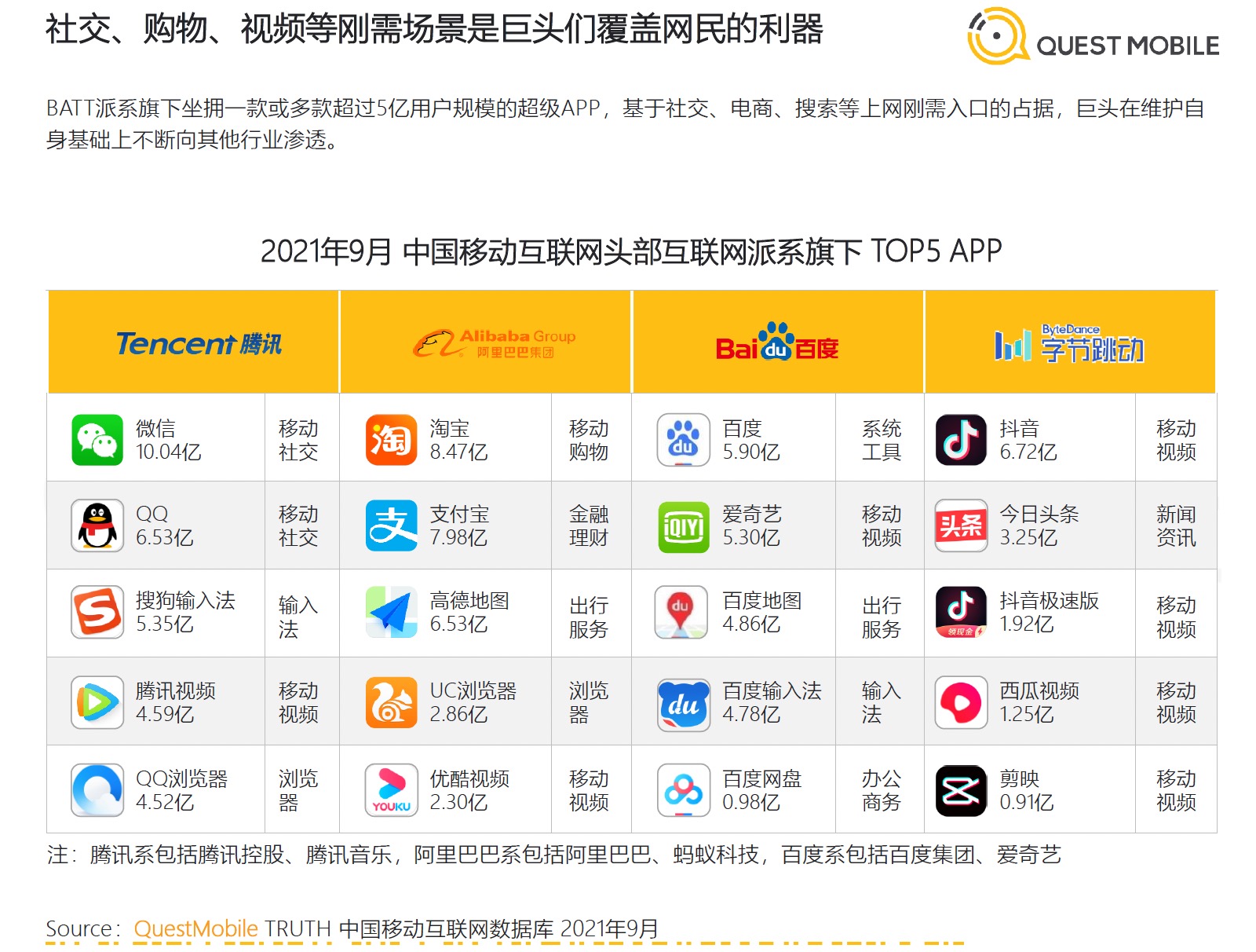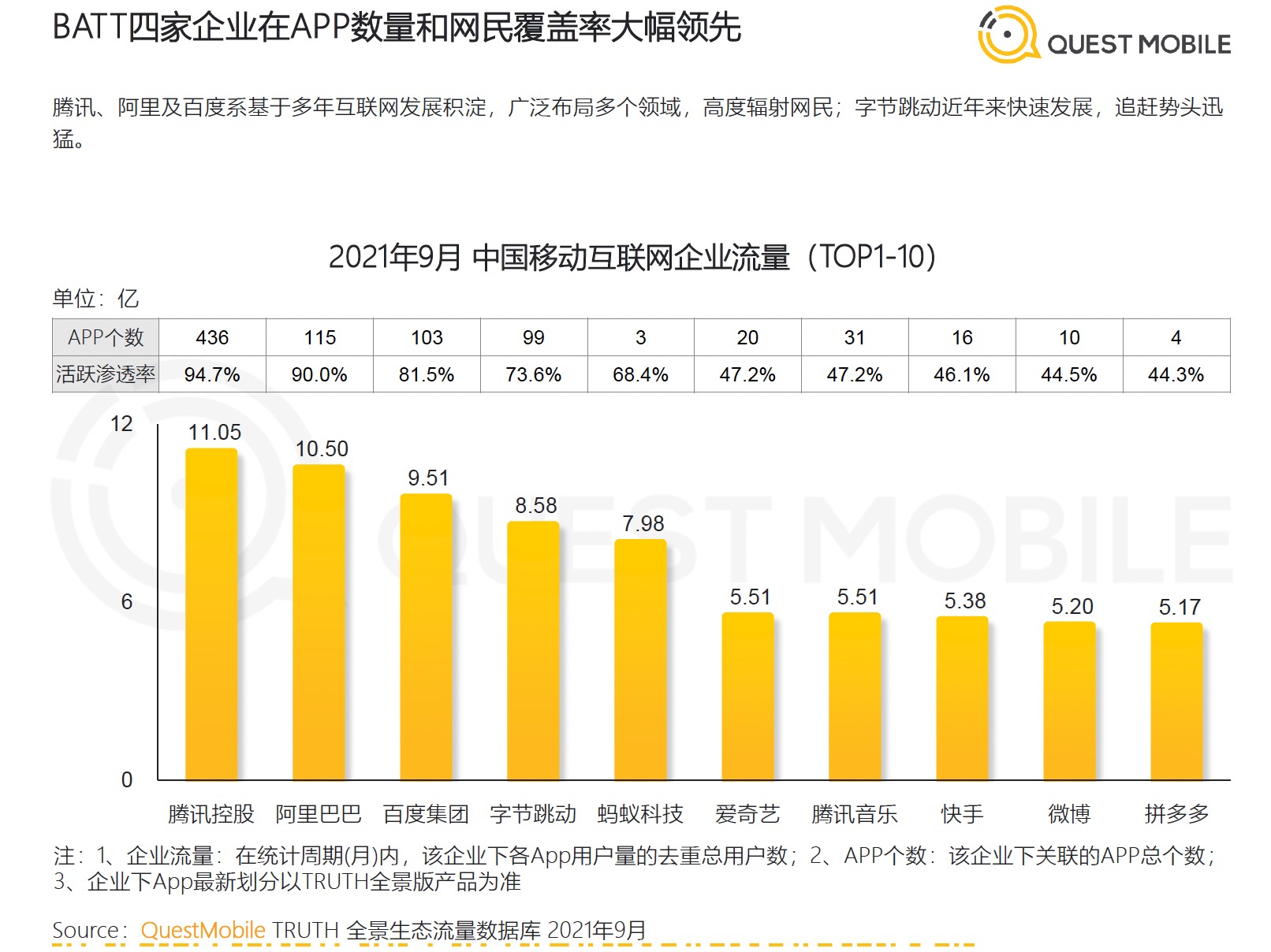 QuestMobile日前发布的《中国移动互联网发展启示录2022版》(以下简称报告)指出,截止到2021年9月,中国移动互联网月活跃用户规模为11.67亿,继续保持低增速。腾讯、阿里、百度等头部平台用户规模依然保持核心优势地位,分别位列前三。