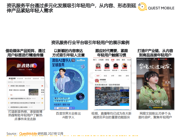 再次,用户价值层面,报告指出,跨界融合阶段的综合资讯平台凭借更广泛的用户、更多的使用场景,更多元化的用户需求洞察,能够为企业营销提供比单一平台更精确的用户画像,提供更丰富的用户价值。比如,QM报告中提到的,通过对用户的精准定位,百度数字人等创新应用受到了年轻人的广泛欢迎。