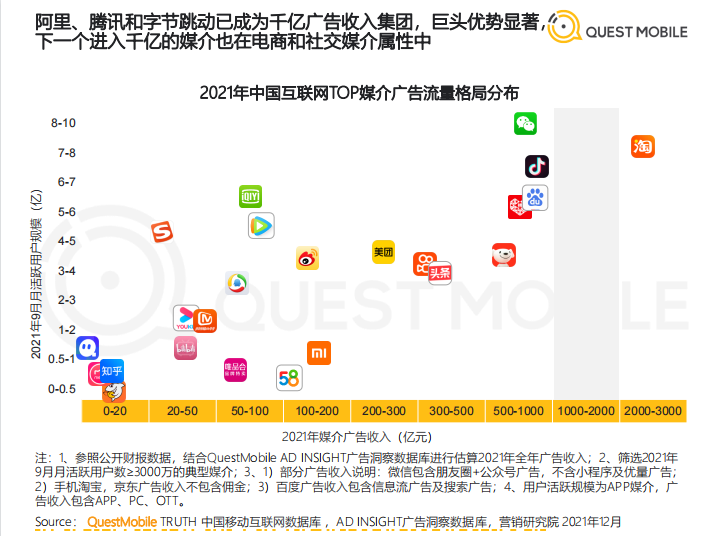 从报告中,2021年中国互联网媒介广告流量分布格局中可以看到,手机淘宝领先,百度APP与抖音持平,高于微信,广告收入接近1000亿元。电商、资讯服务、社交平台媒介广告收入整体领先。