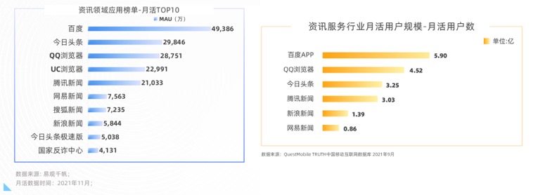 QM和易观千帆数据均显示,百度App已经成为资讯领域TOP1应用,领先今日头条、腾讯新闻等其他资讯App。