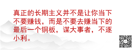 真正的长期主义并不是让你当下不要赚钱,而是不要去赚当下的最后一个铜板,谋大事者,不逐小利。长期思维并不是短期不作为的对立面,而是一种基于复利思考的商业模式。