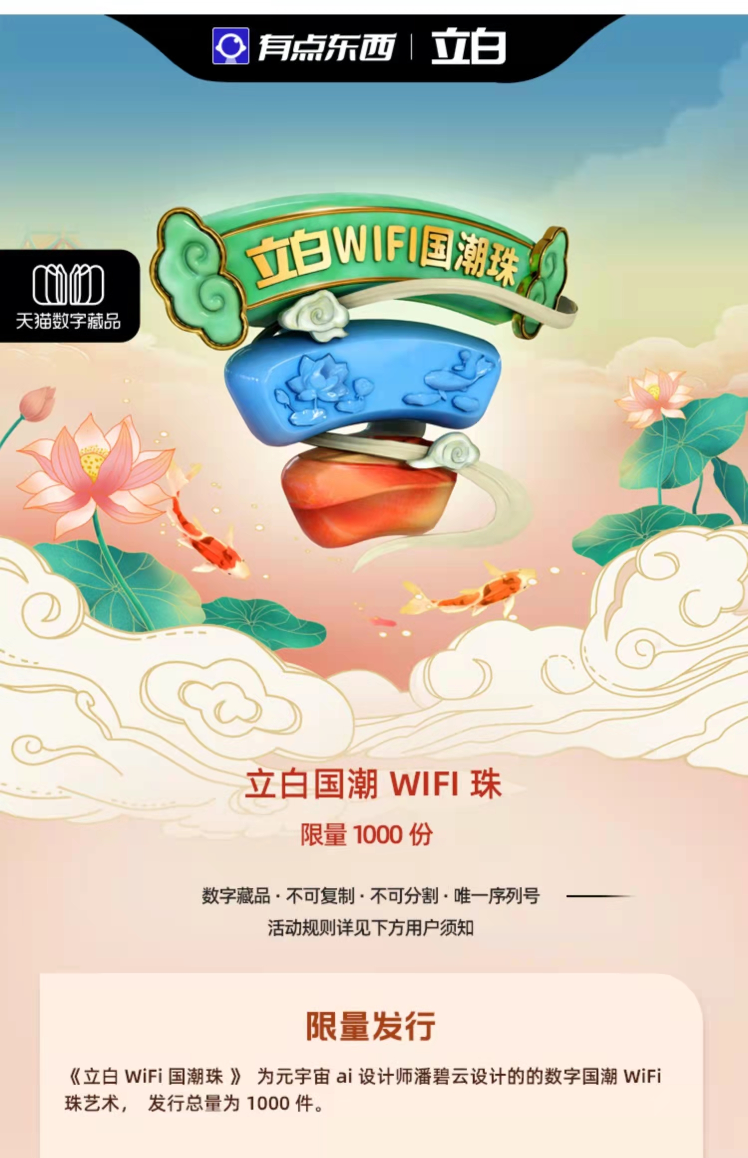 有意思的是,天猫有点东西此次买赠数字藏品合作,甚至还请来了立白这样看似传统气质浓郁的品牌,一同拓展品类参与诠释“元宇宙”的想象力外延。而立白拿出来的WIFI国潮珠数字藏品,传统与潮流协同激荡,吸睛力也属实拉满。