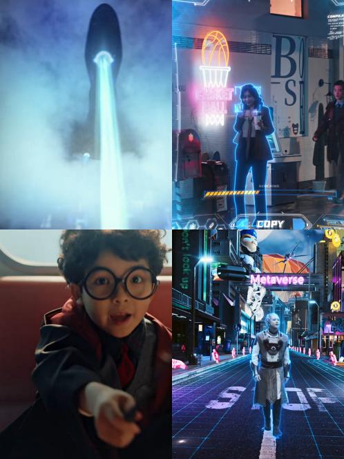值得一提的是,这条TVC的创意执行,短短2分钟里嵌入了多处致敬经典的彩蛋:有《赛博朋克2077》式的废土霓虹街区,有《光晕》式的外星球飞船造型,有《龙珠》的战力探测器,有《哈利波特》的眼睛小巫师元素,有各种美剧里常见的剧情道具多拿滋甜甜圈,也会模仿马龙、张继科的动作操练国球兵乓你来我往。当然,整个剧本情节的走向,也明显紧随柳夜熙等国产虚拟人人设IP的风口,也有助于第一时间抓住相关兴趣人群的注意力焦点,为此次天猫有点东西此次“解锁元宇宙”的选题,高速率引流。