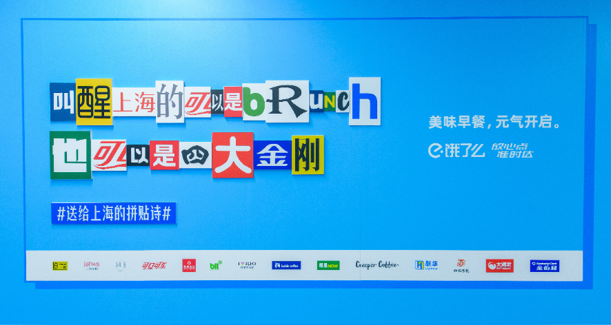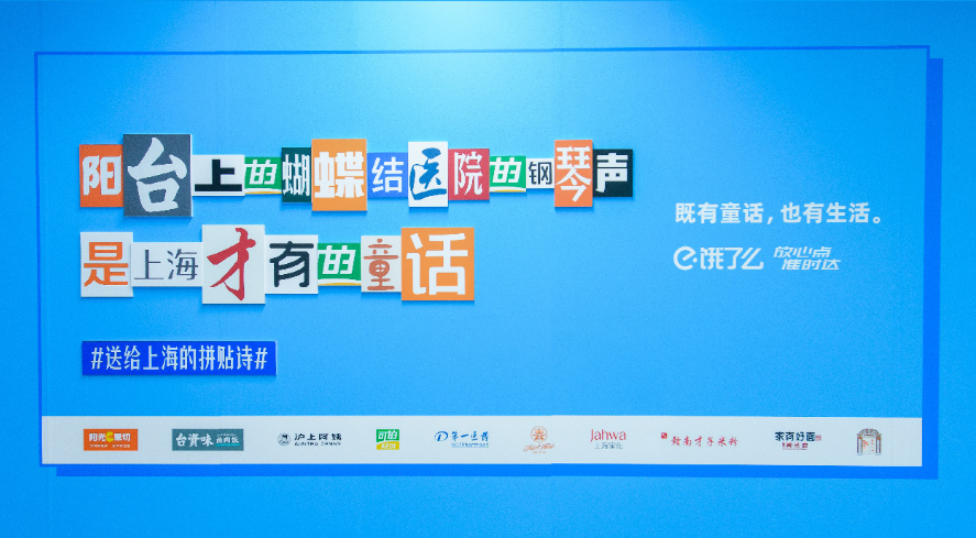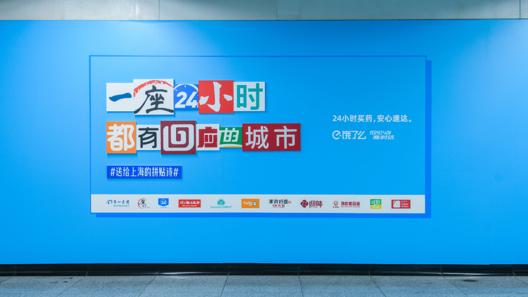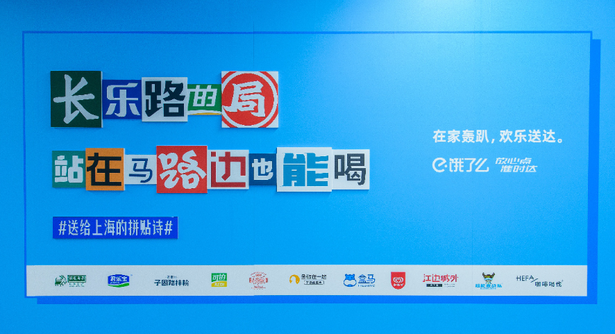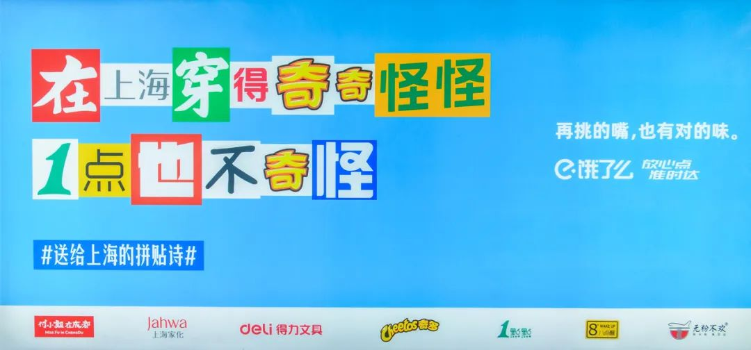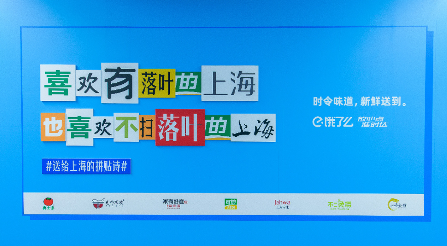 在上海人民广场地铁站上,饿了么联合平台上214个品牌献上了一组「送给上海的拼贴诗」。拼贴诗的每个字皆使用品牌LOGO&ICON的字体。