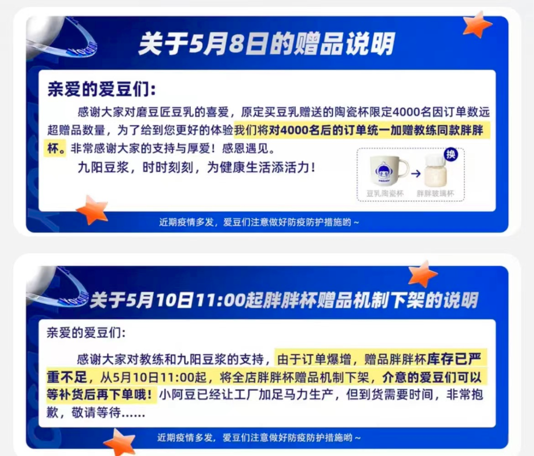 而订单量的暴增,让九阳豆浆应接不暇,淘宝店铺首页连挂两条说明,感谢网友支持。