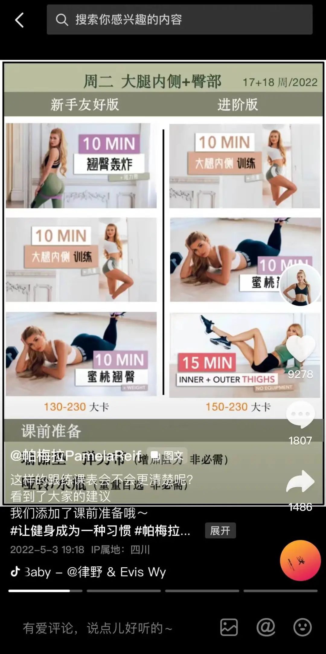 五一假期期间,原本只发布单节录制版课程的帕梅拉也开启了抖音直播。尽管内容仍是多个视频的轮播,而非本人互动带操,被不少人吐槽没有诚意,但强度较高的训练课程搭配还是方便了许多有一定运动基础且非常自律的网友跟练。