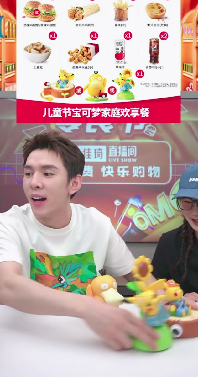 5月17日,李佳琦直播间率先上架肯德基六一儿童节套餐兑换券。套餐内附赠三款宝可梦玩具——皮卡丘音乐盒、皮卡丘郊游水壶和可达鸭音乐盒。