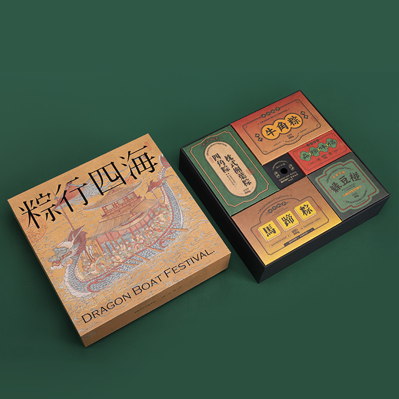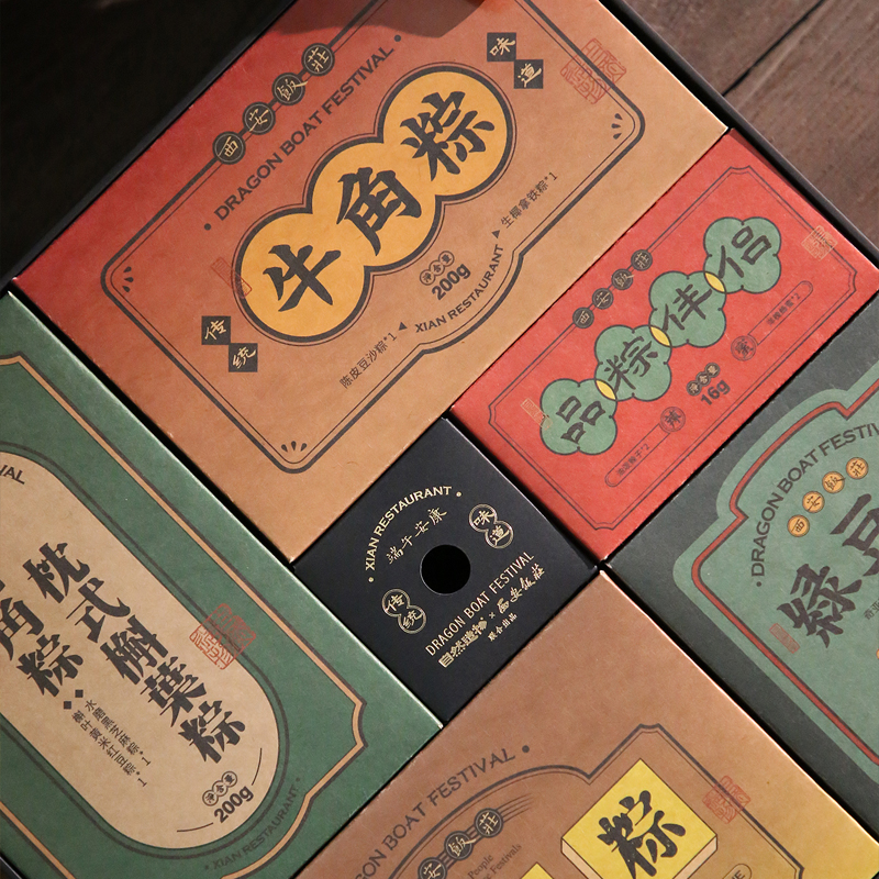 礼盒正面印有鼓楼与龙舟的原创插画,契合端午习俗及陕西特色两大主题,内盒选用民国时中式复古风。