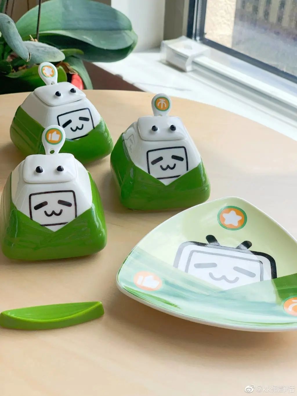 BILIBILI的端午礼盒里有陶瓷小电视粽式餐盘和调料罐,太可爱了吧~
