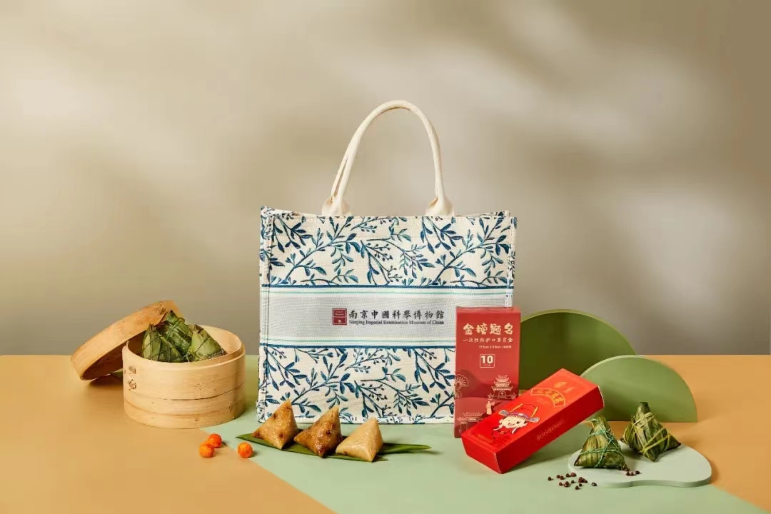 中、高考就要来临了,南京中国科举博物馆与金丝利喜来登酒店联名推出“包你高中”端午礼袋。托特包里有糕、有粽、还有口罩——