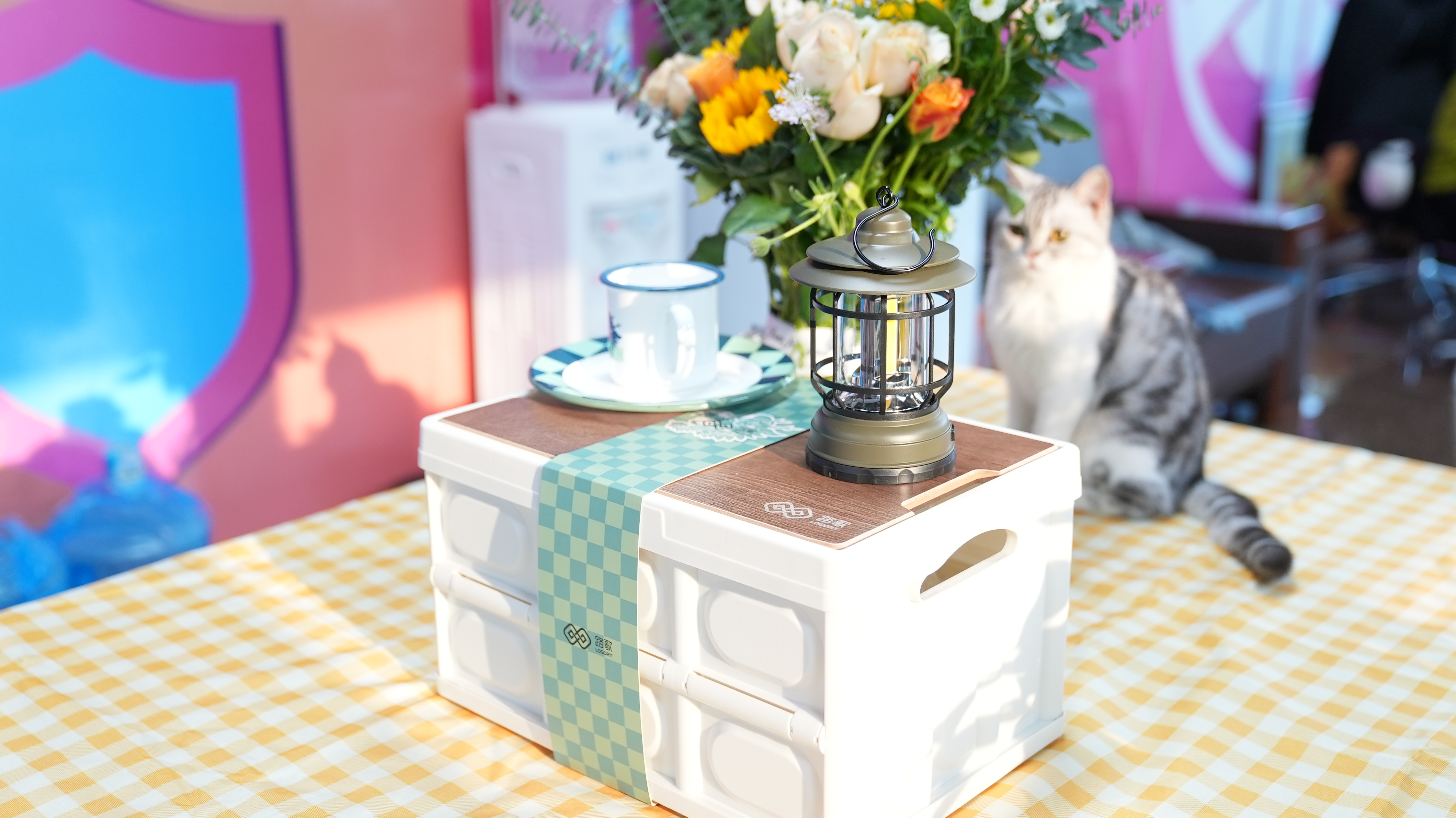 礼盒内含露营户外折叠收纳箱、ins风棋盘格搪瓷盘、复古搪瓷杯、营地氛围灯、格纹露营野餐垫、太空人随身风扇、驱蚊手环,太实用啦!