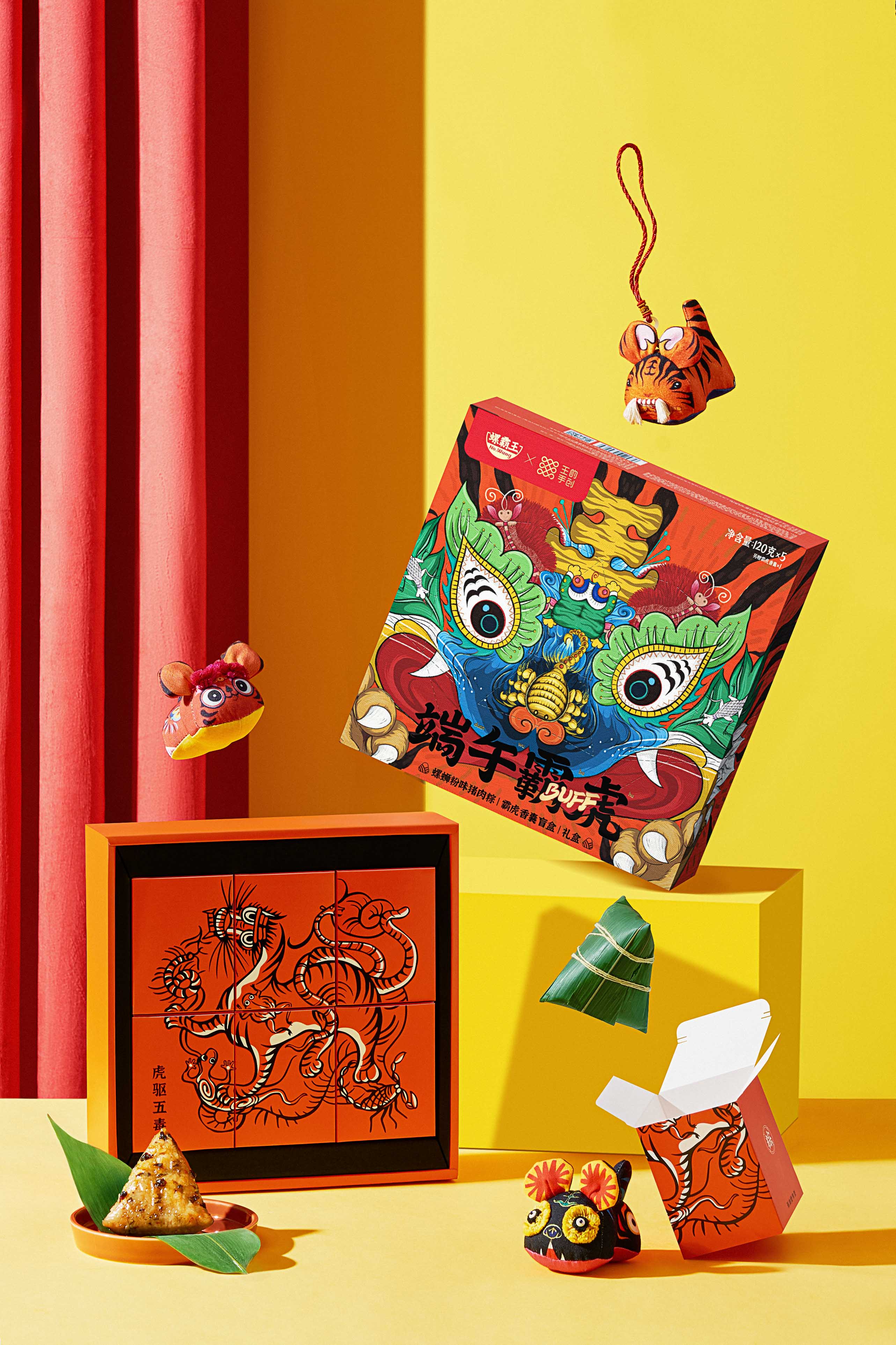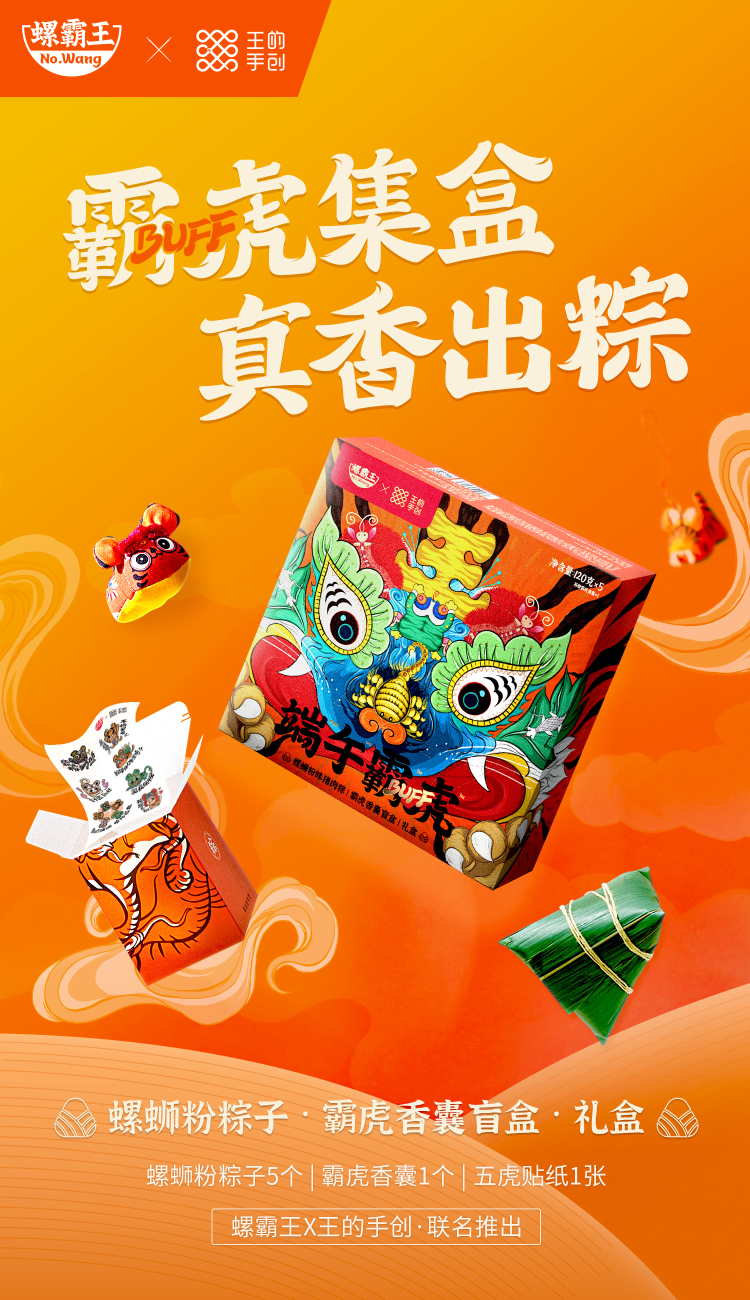 螺霸王联名传统手作民艺「王的手创」,限量推出“端午霸虎螺蛳粉粽子礼盒”。