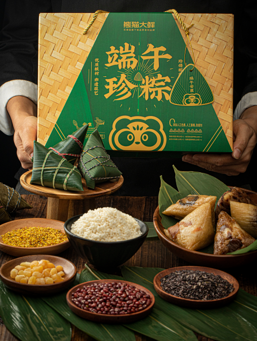 百果园的粽子礼盒来自旗下高品质食品品牌熊猫大鲜。礼盒采用传统竹编+粽叶的设计,传达“望君珍重”的理念。
