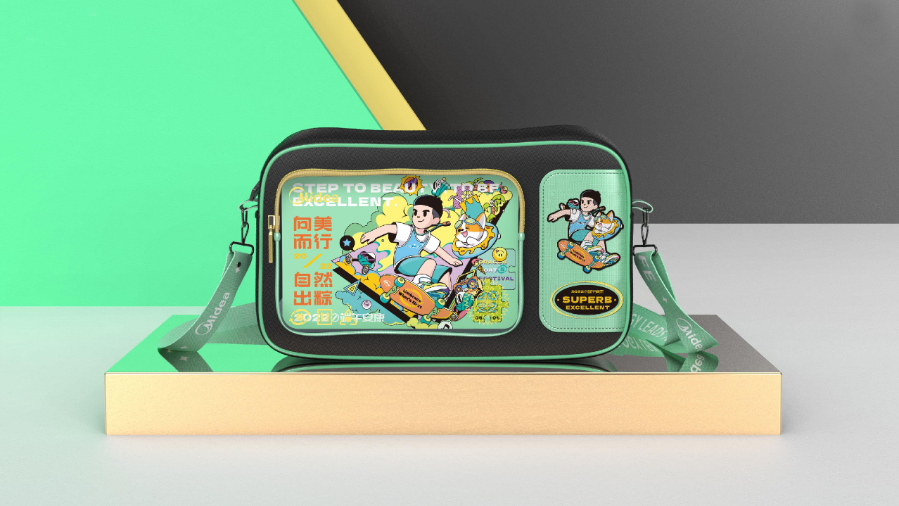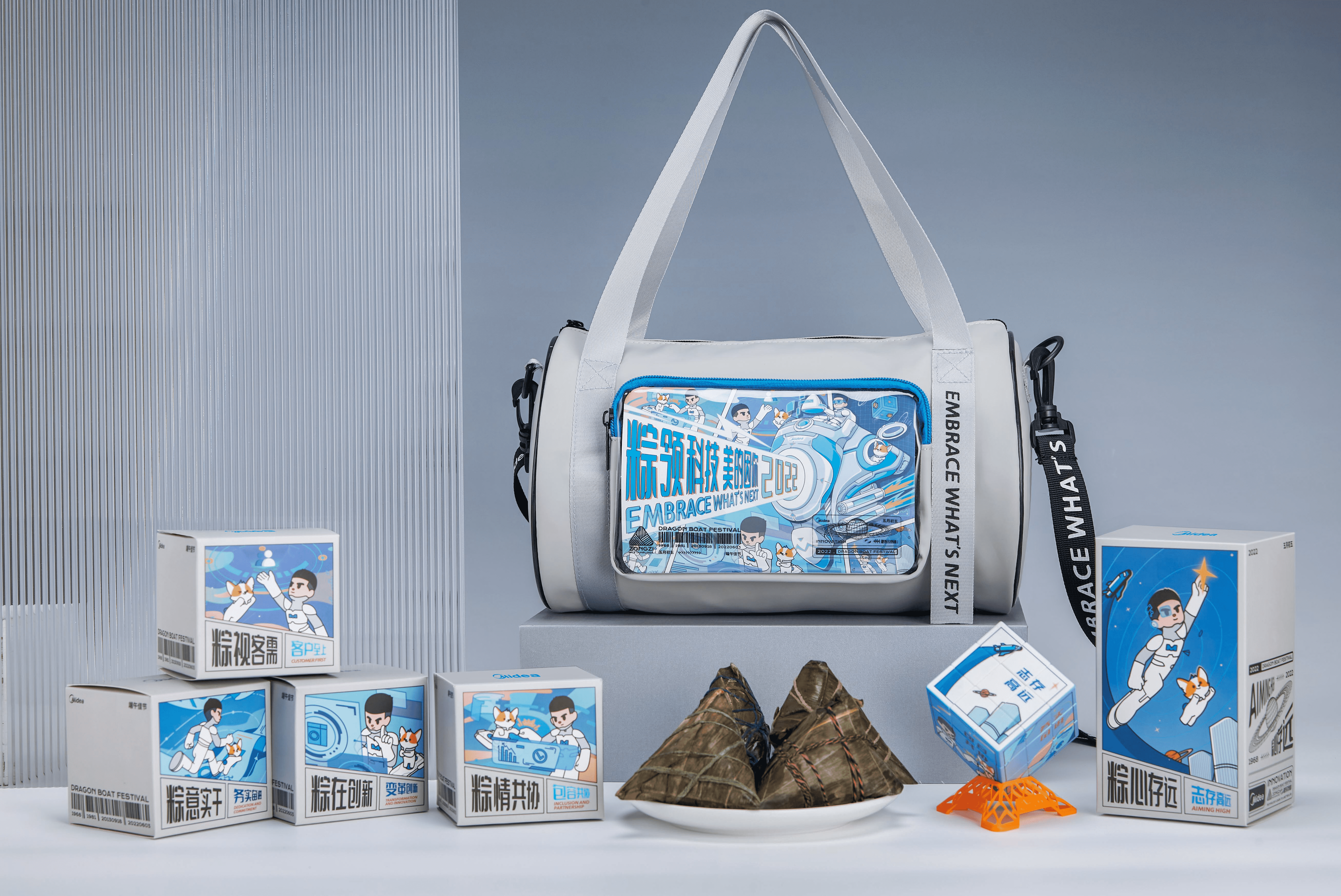 包包上的漫画各不相同,画面中的“飞船探照灯”元素,正照亮礼盒主题“粽领科技,美的因你”。