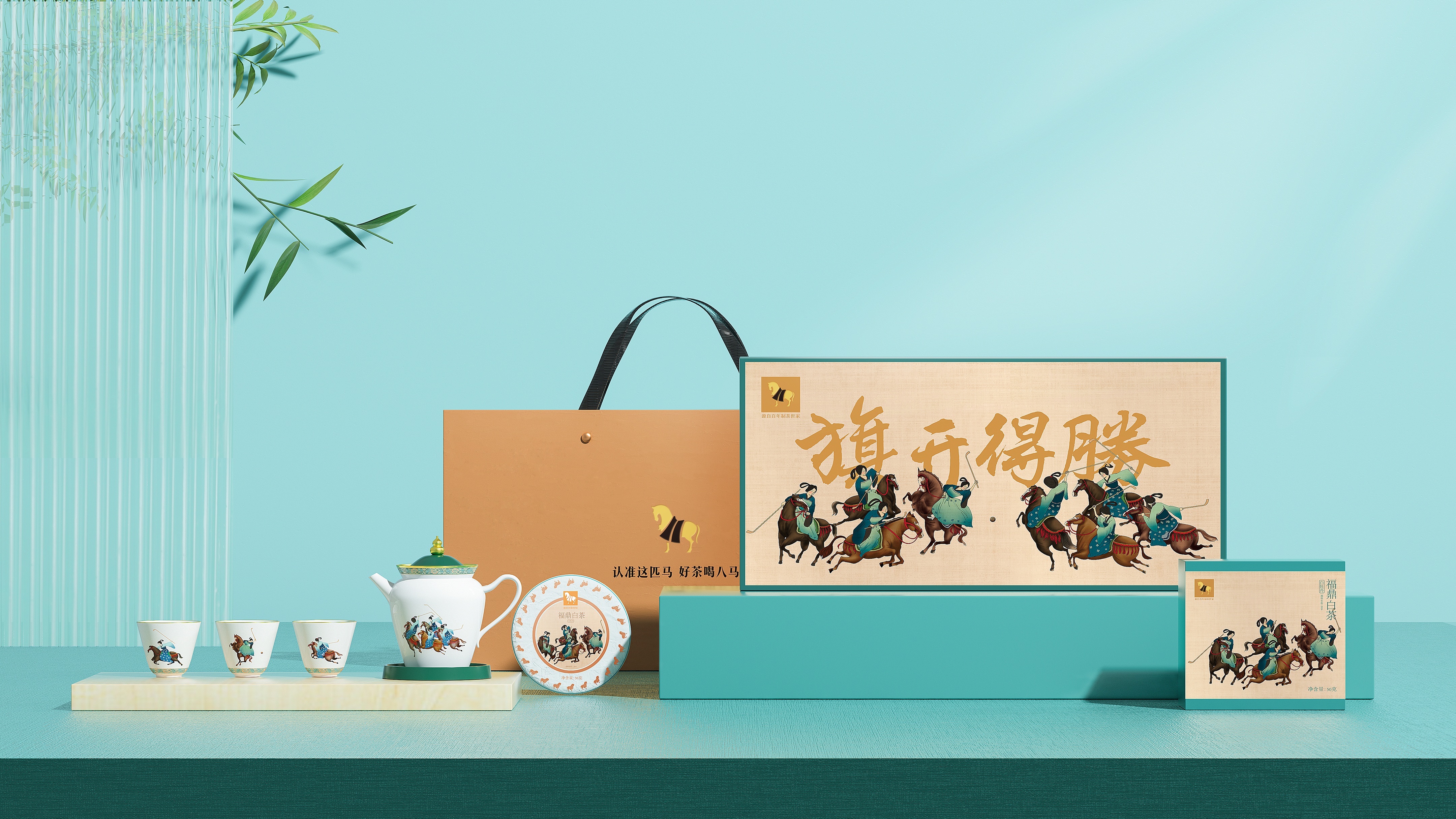 “击鞠”(打马球)是古时端午重要习俗之一。设计主题围绕“击鞠”,选择今年大热的青绿色系与仿古插画作为主视觉,营造热闹的唐代女子马上竞技,角逐胜利的场面。