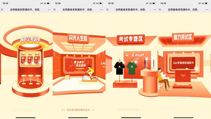 H5里设置多重交互装置,在【跨时空电话亭】你可以接听“时空来电”,聆听那些来自不同身份标签的人的喜悦与烦恼;走到【闪光人生路】,点击单车少年,点亮“蓄力发光,百乐陪你”;漫步【考试专题区】,这里不仅有高光战衣、P-500考试笔,还有电话亭礼盒,让你身披光芒、手握梦想;最后的【脑力测试区】,你可以收获一张趣味满满的录取通知书,如果你是应届考生,希望你能带着这份美好祝福步入考场;如果你早已经历过高考,希望你能重温校园美好,并带着这份美好继续前行。