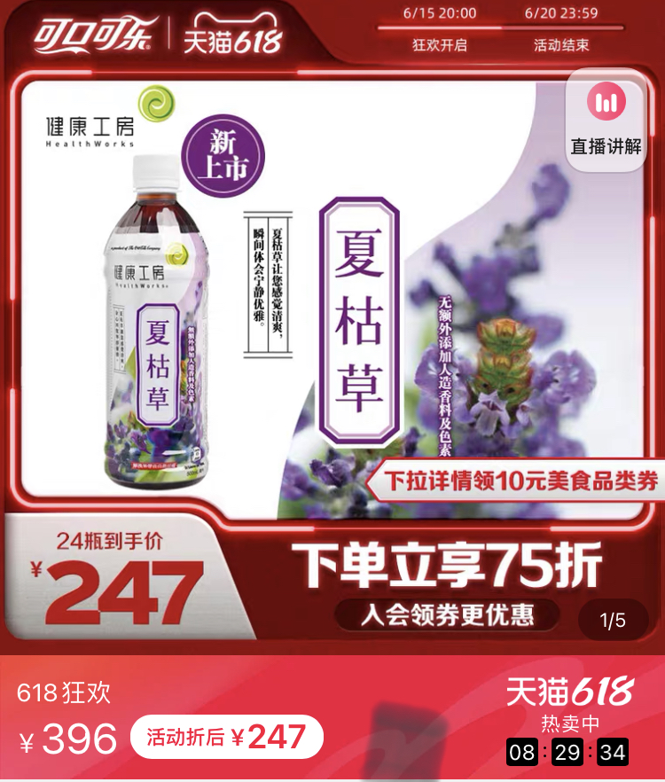 凉茶名为“夏枯草”,主打“清热降火”,文案写到“草本配方,传统凉茶,不额外添加人工香料及色素”。