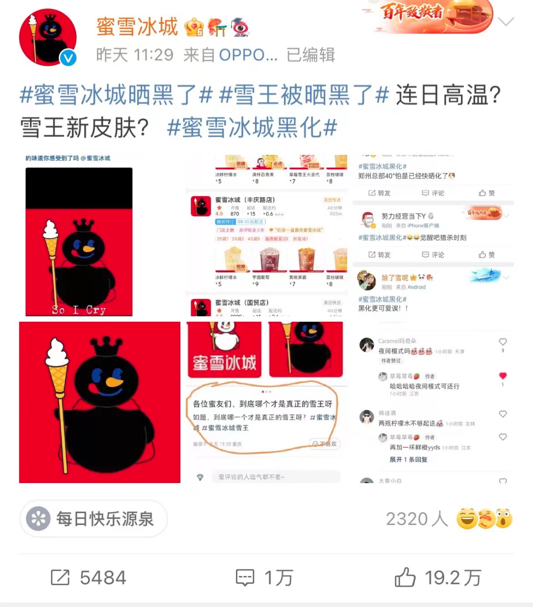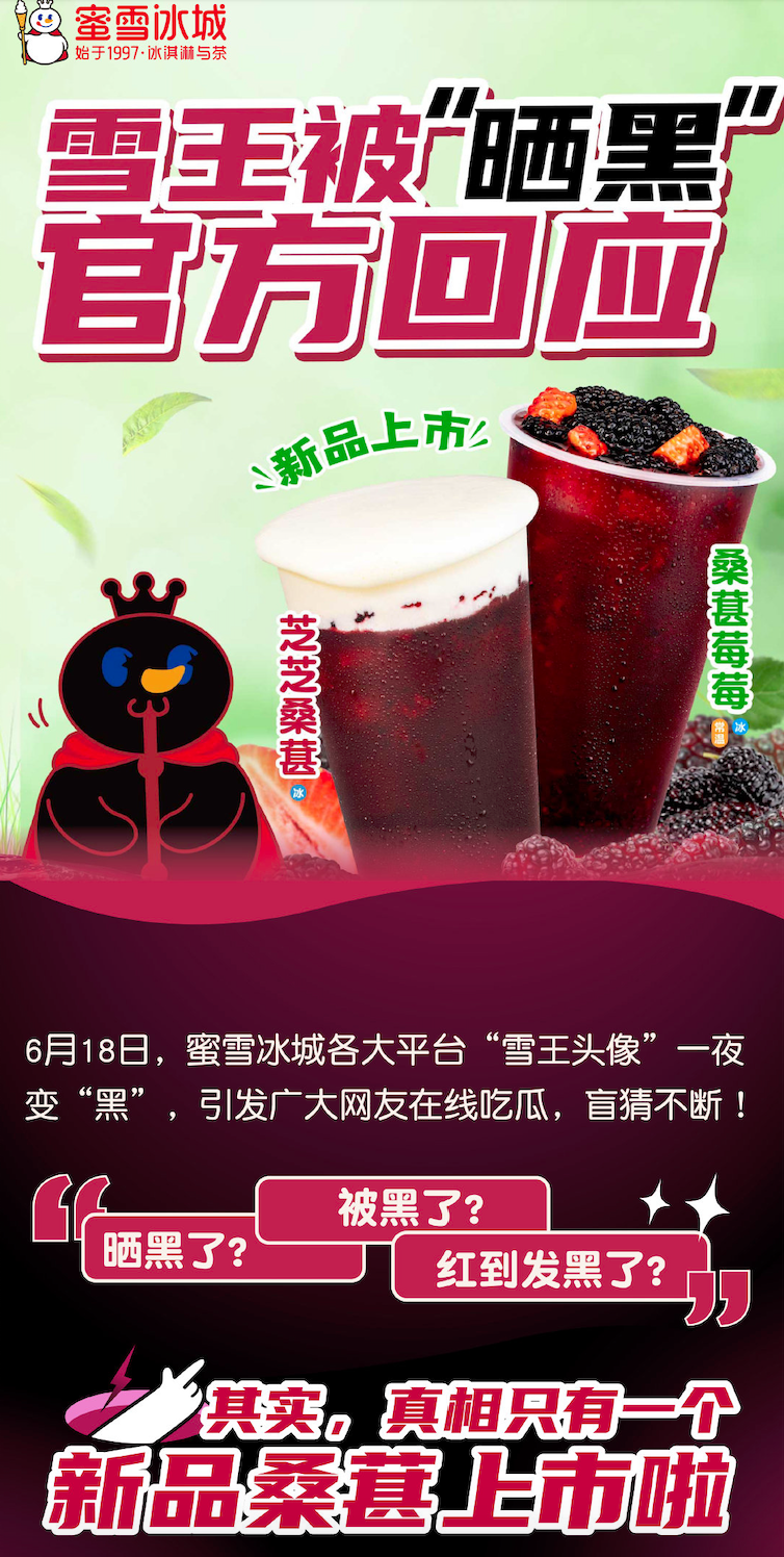 蜜雪冰城借助网友对炎热天气的讨论,用黑化雪王制造话题,为新品上市增加曝光。