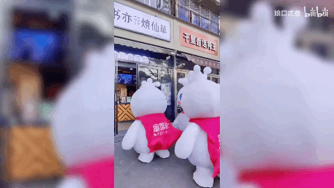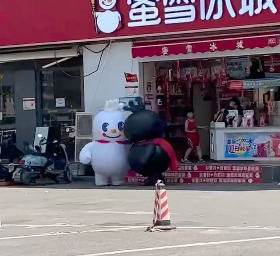 蜜雪冰城的某家店铺门口,冒出个黑雪王与白雪王斗殴......