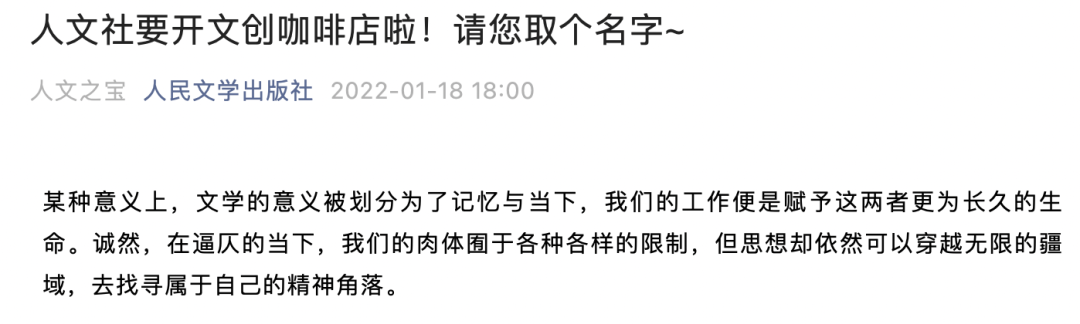 今年1月,人民文学出版社在其官微透露,将在北京带来首家咖啡店(并征集店名),以此为读者提供一处别样的精神角落。