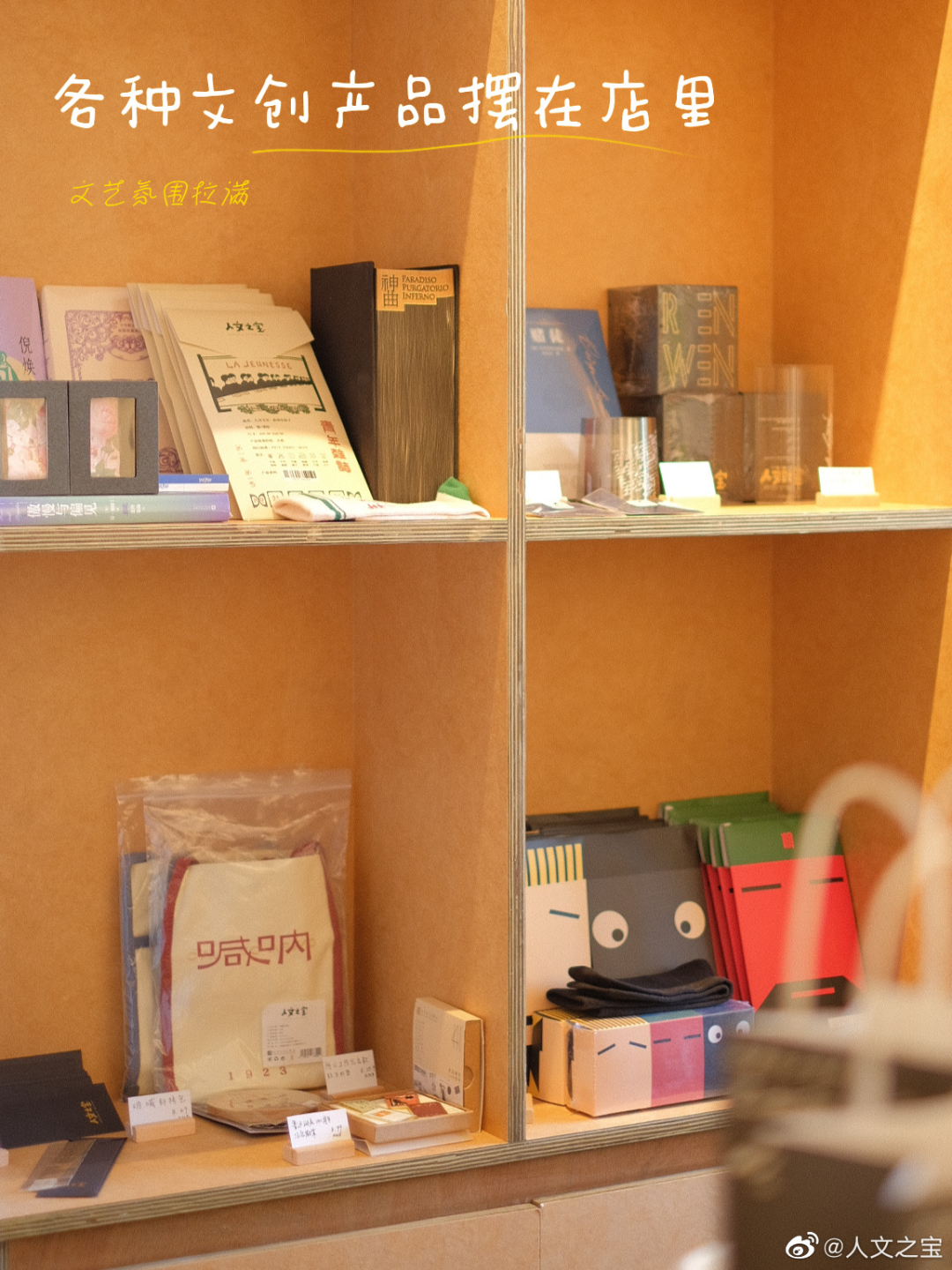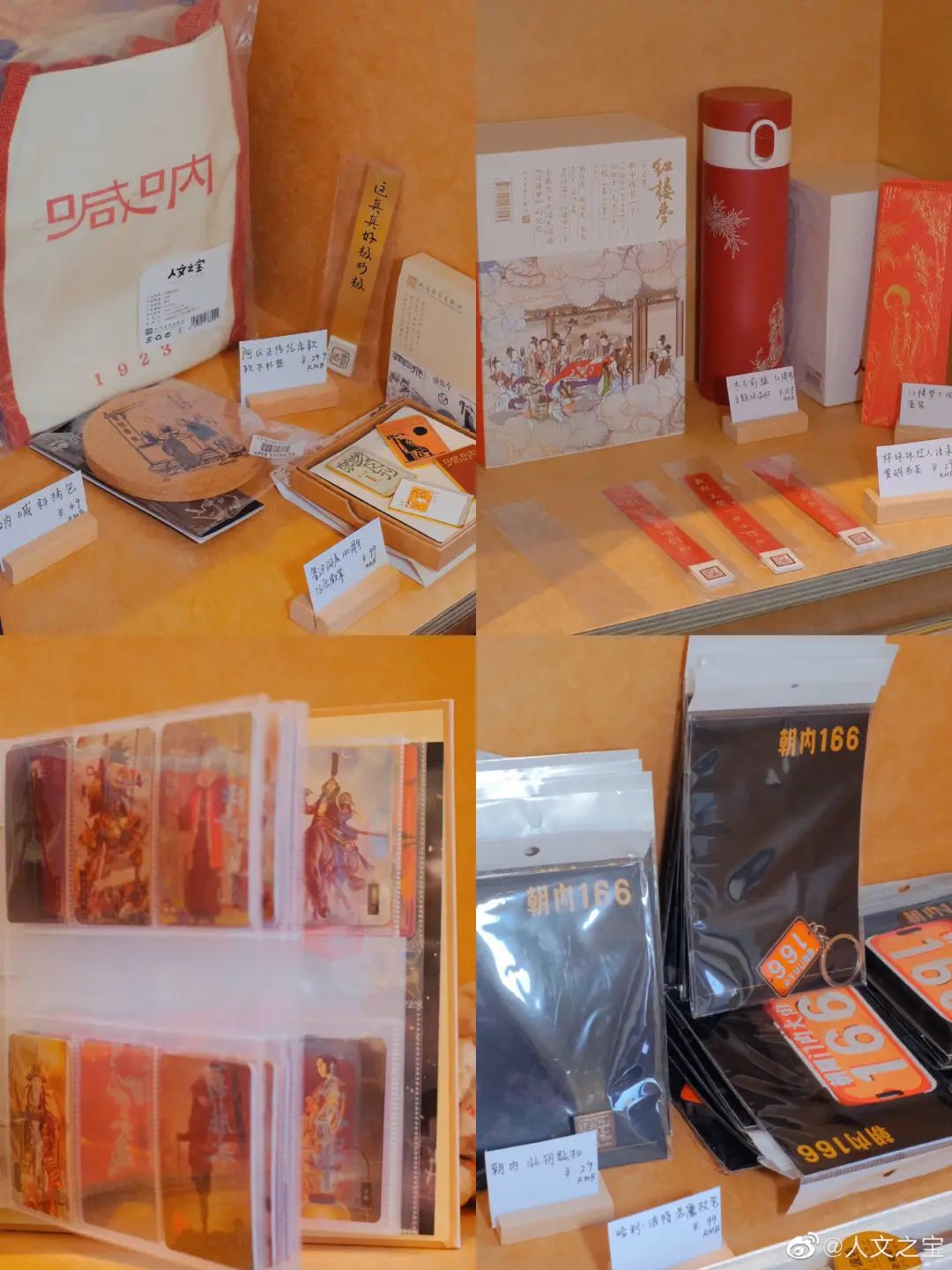 另外,墙壁摆满了文学周边、文创产品,茶杯、书签、帆布袋、文件夹……应有尽有。