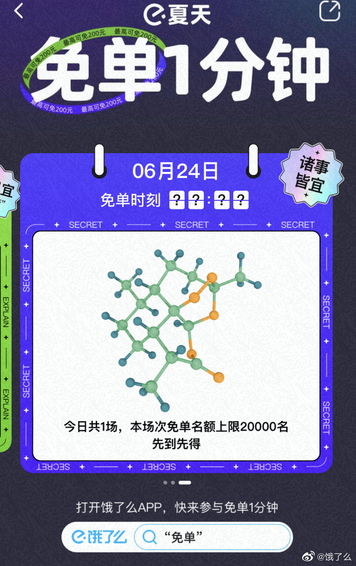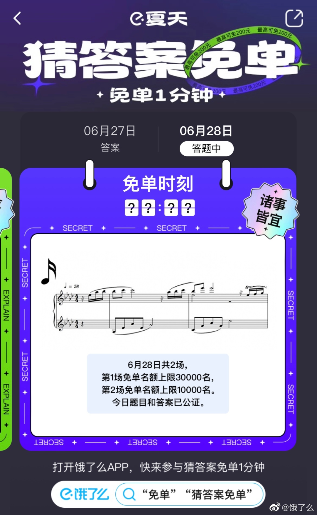 下载个饿了么APP,根据@饿了么 给出的题目找到免单时间,最后在指定的一分钟内及品类里完成下单(不超过200元),先到先得(拼手速)。