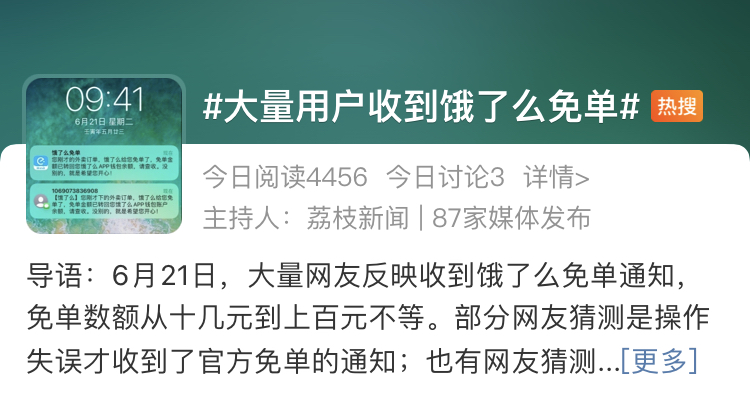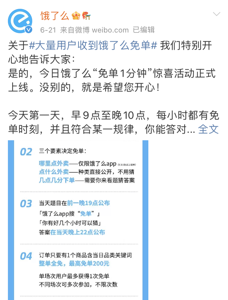 下午四点,经过7个小时的网络发酵,伴随着越来越多的猜测(营销活动or真的bug)后,饿了么终于露出庐山真面目,在微博官宣#饿了么免单#活动,并发布活动规则。