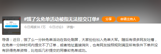 微博上,#饿了么免单#、#饿了么免单1分钟#等相关话题阅读次数累计超过20亿。