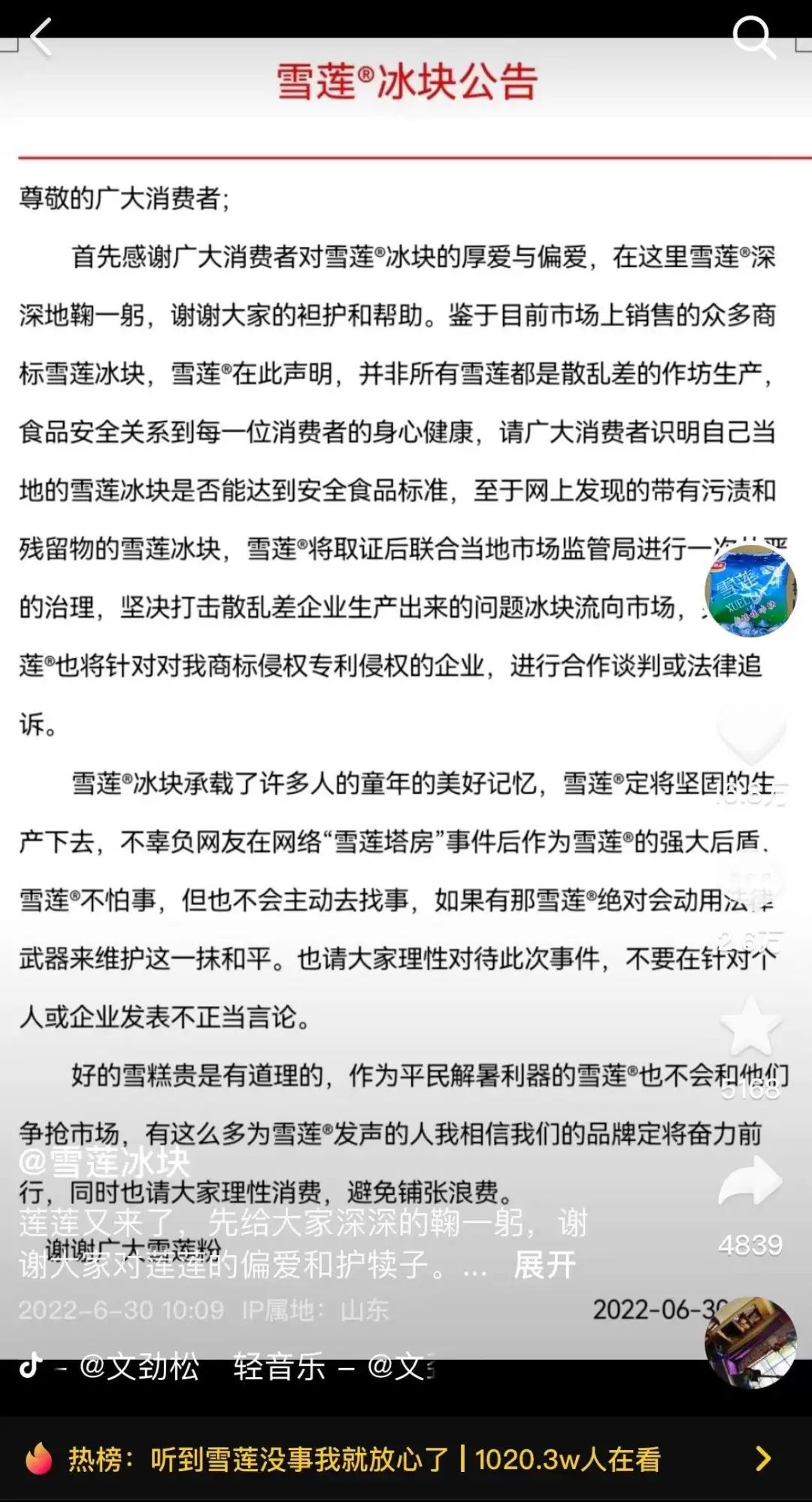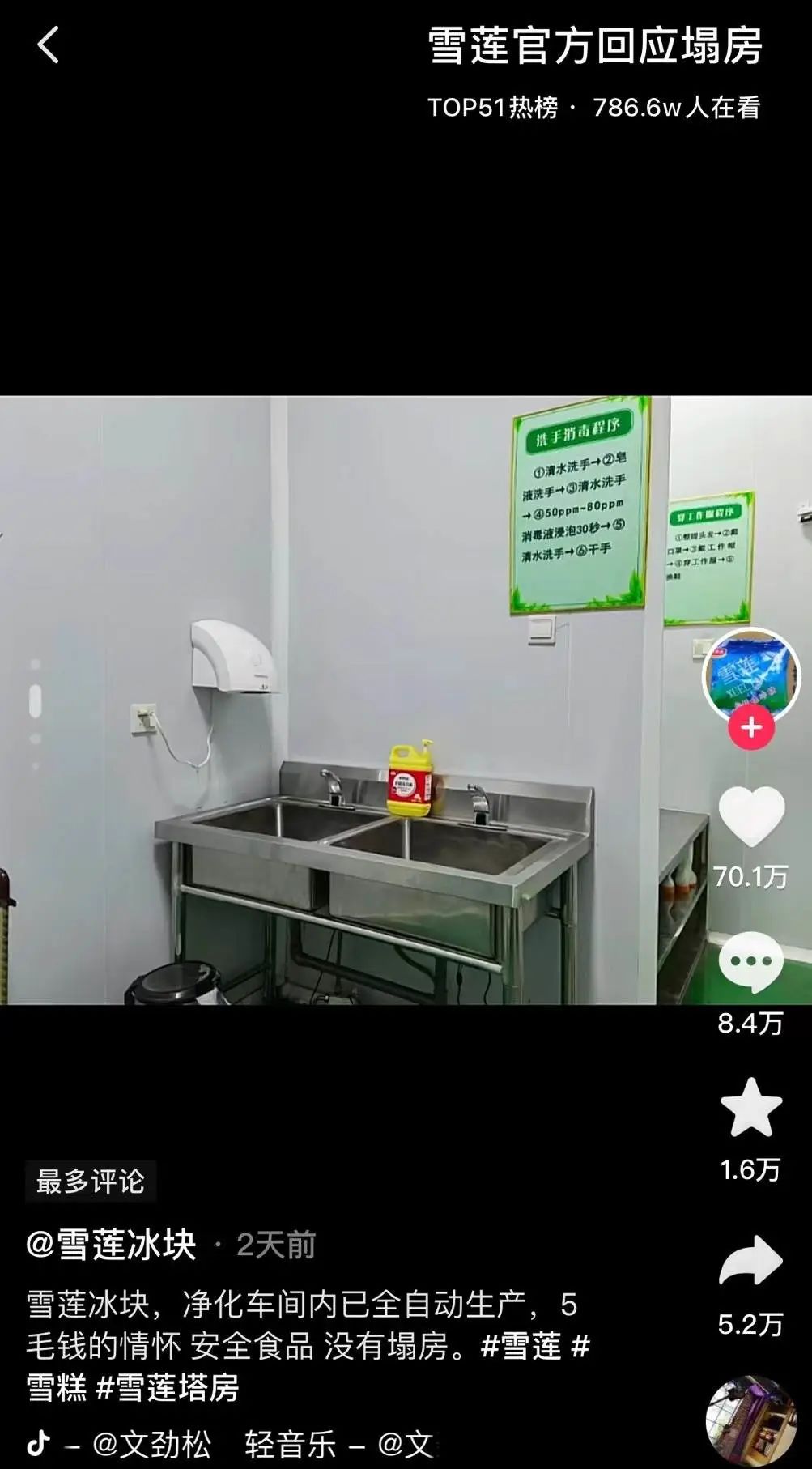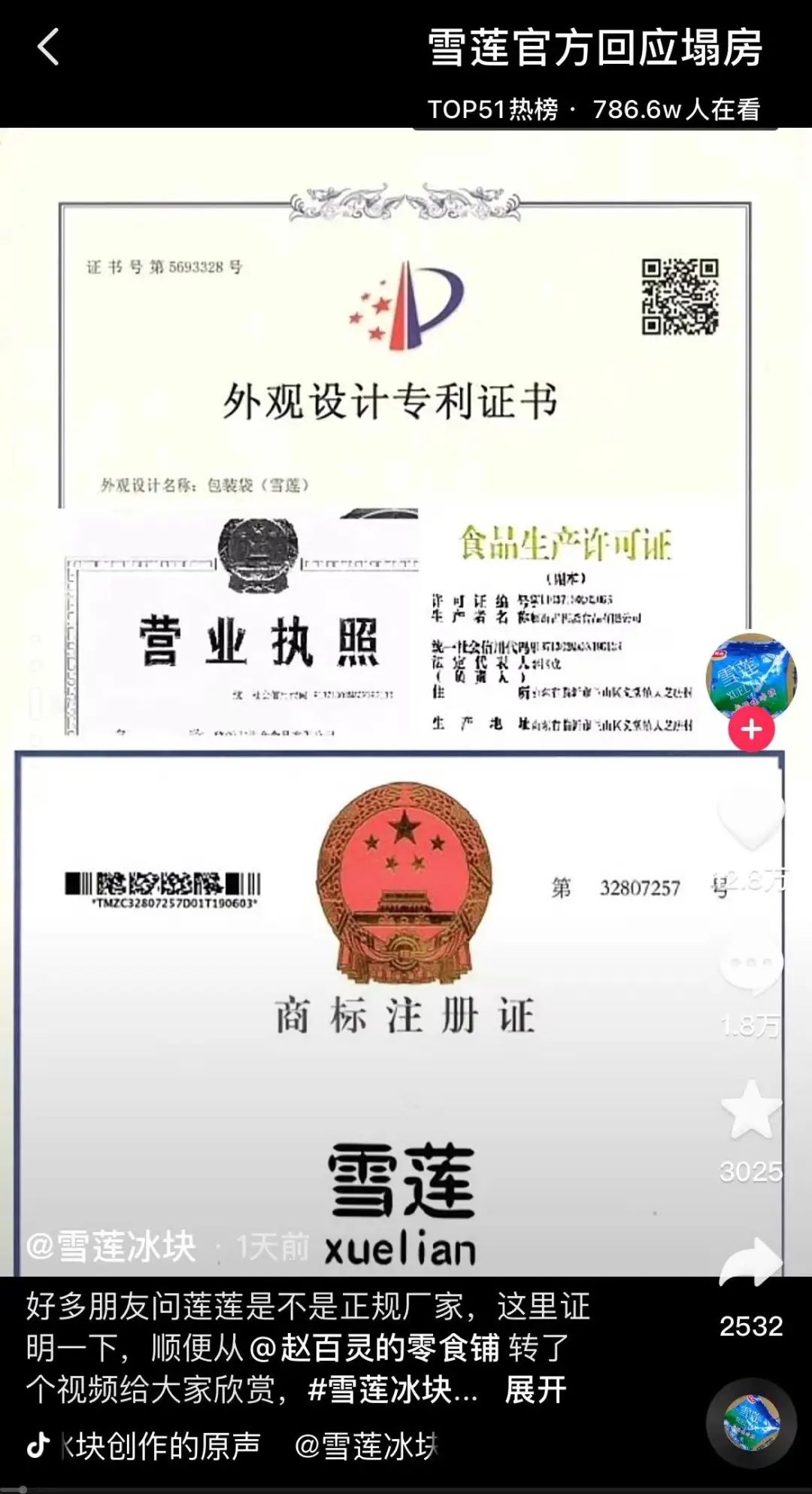 食品安全问题就是炸雷。这一下子把“国货品牌”雪莲急得,连夜注册抖音账号来辟谣。