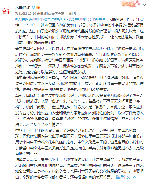 7月16日下午,人民热评发表评论:何为“标志性”“全新”?迪奥需回应舆论关切。