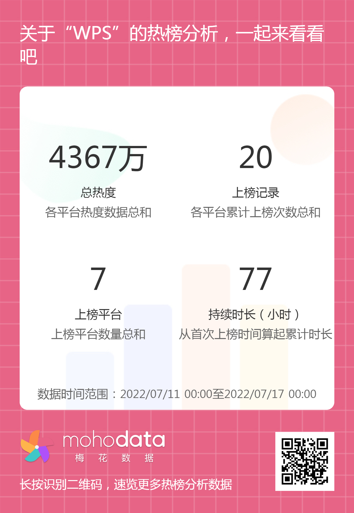热搜方面,WPS事件相关热搜热度总计4367万,上榜记录20次,上榜平台7家,持续时长77小时。详情可扫描以下二维码查看。