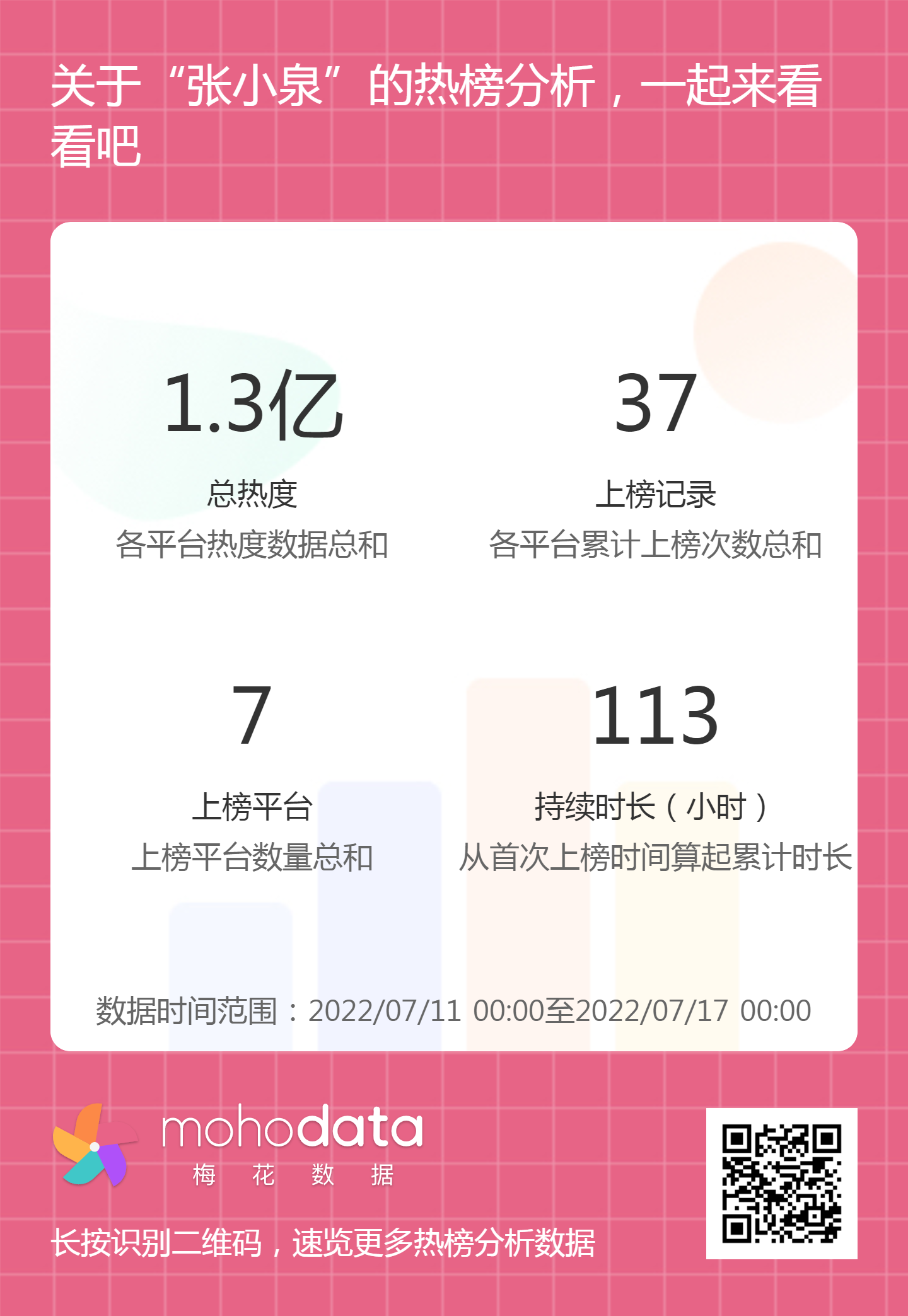 热搜方面,张小泉事件相关热搜热度总计1.3亿,上榜记录37次,上榜平台7家,持续时长113小时。详情可扫描以下二维码查看。