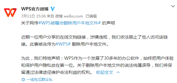 “近期一位用户分享的在线文档链接,涉嫌违规,我们依法禁止了他人访问该链接。此事被讹传为#WPS#删除用户本地文件。