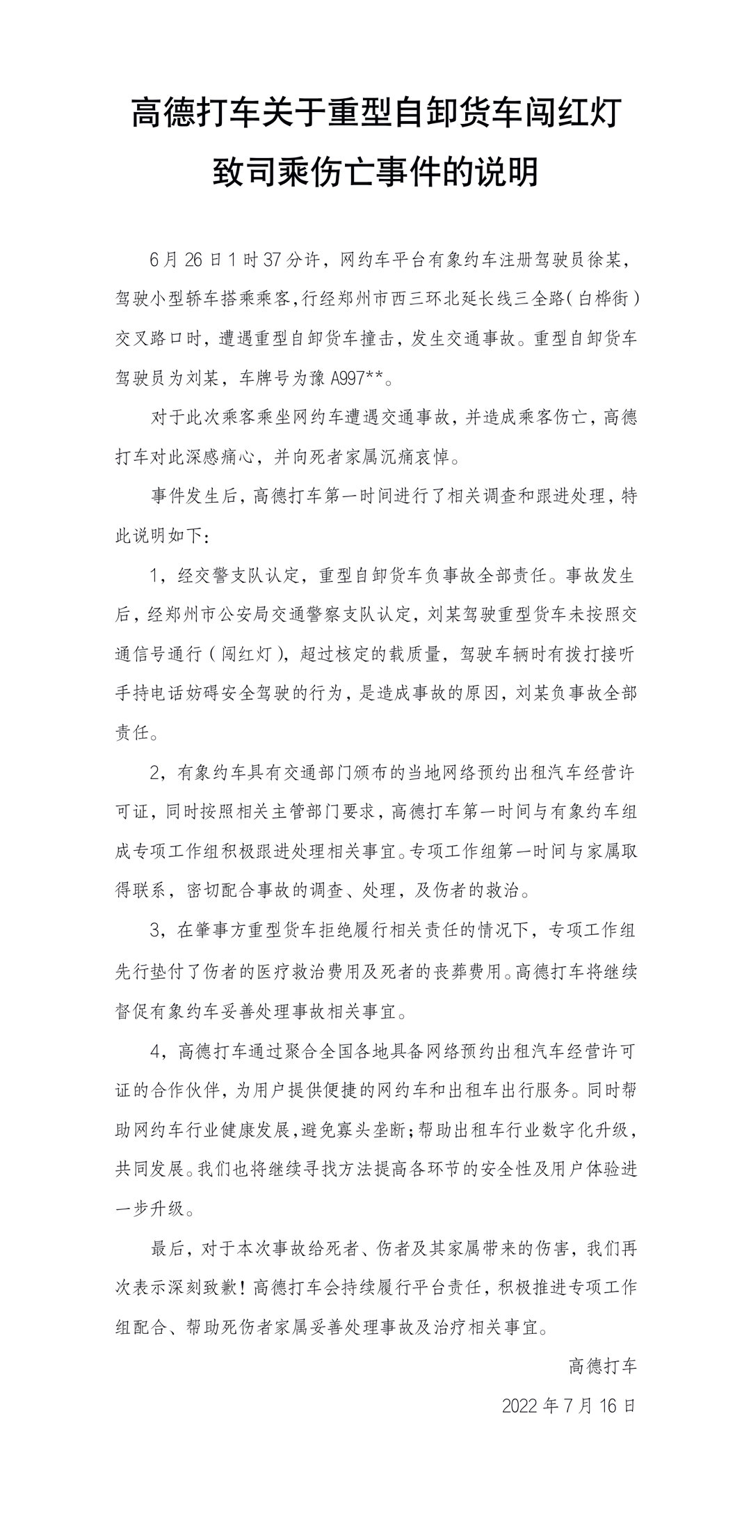 7月16日晚,高德打车官方微博对此事回应称:经交警支队认定,重型自卸货车因闯红灯且超过核定载质量,并有驾车拨打接听手持电话妨碍安全驾驶的行为,负事故全部责任。有象约车具有交通部门颁布的当地网络预约出租汽车经营许可证。