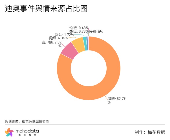 其中信息来源分布图如下图所示,声量主要集中在微博,微博占比82.79%,其他信息来源占比不超过10%。