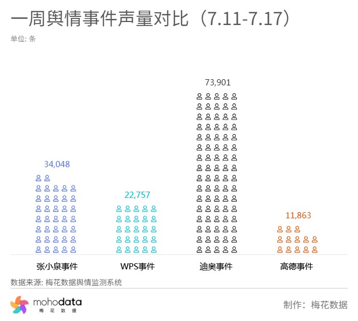 根据梅花数据舆情监测系统监测,在7月11日-7月17日,此事件共监测相关舆情声量总计声量73901条,敏感度79.50%。