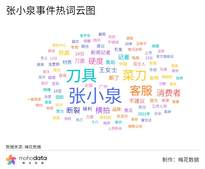 声量热词方面,热词云图如下所示,其中“客服”、“硬度”、“断裂”、“刀面”、“不建议”、“材质”等词汇排名较前。