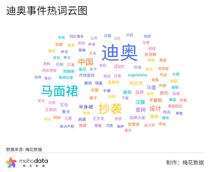 声量热词方面,热词云图如下所示,其中“马面裙”、“抄袭”、“设计”、“半身裙”、“汉服”、“不要脸”等词汇排名较前。