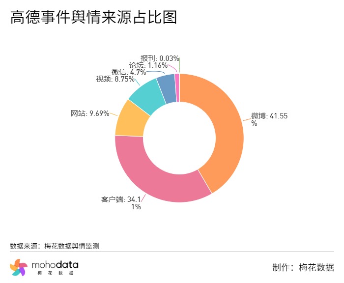 其中信息来源分布图如下图所示,声量主要集中在微博,微博占比41.55%,客户端占比34.11%,其他信息来源占比不超过10%。