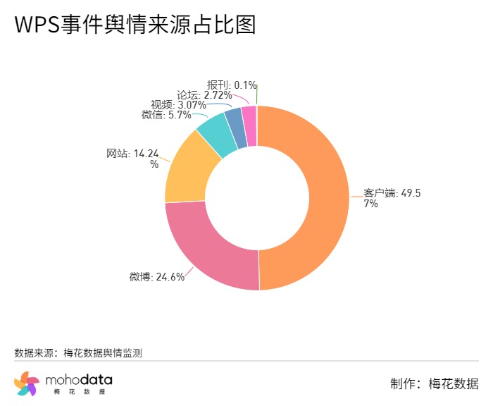 其中信息来源分布图如下图所示,声量主要集中在客户端,客户端占比49.57%,微博占比24.60%,网站占比14.24%,其他信息来源占比不超过10%。