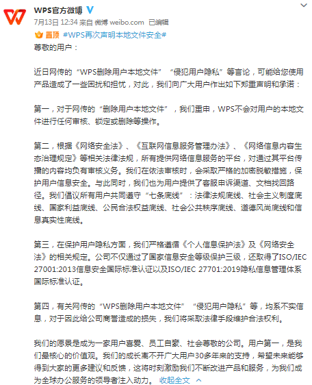 7月13日,WPS再发声明称:对于网传的“删除用户本地文件”,我们重申,WPS不会对用户的本地文件进行任何审核、锁定或删除等操作。