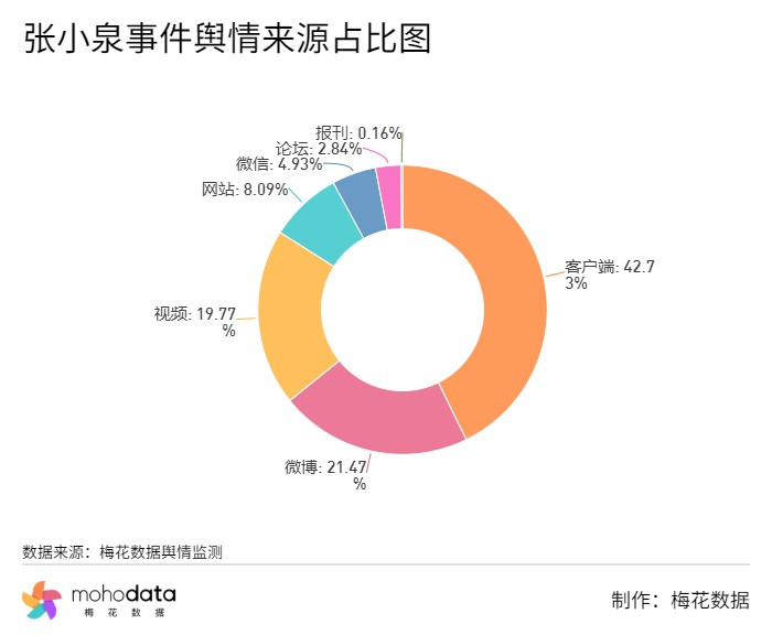 其中信息来源分布图如下所示,声量主要集中在客户端,客户端占比42.73%,微博占比21.47%,视频平台占比19.77%,其他信息来源占比不超过10%。
