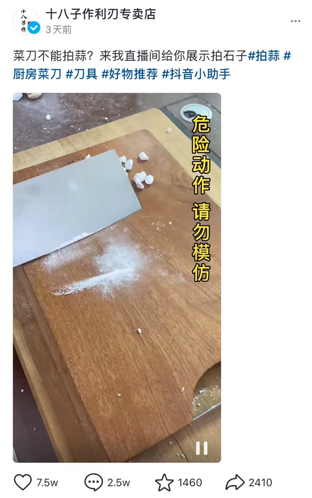 难道是在暗示“竞品的刀也会断”,以此来反击友商直播间拍大蒜拍鹅卵石的做法?
